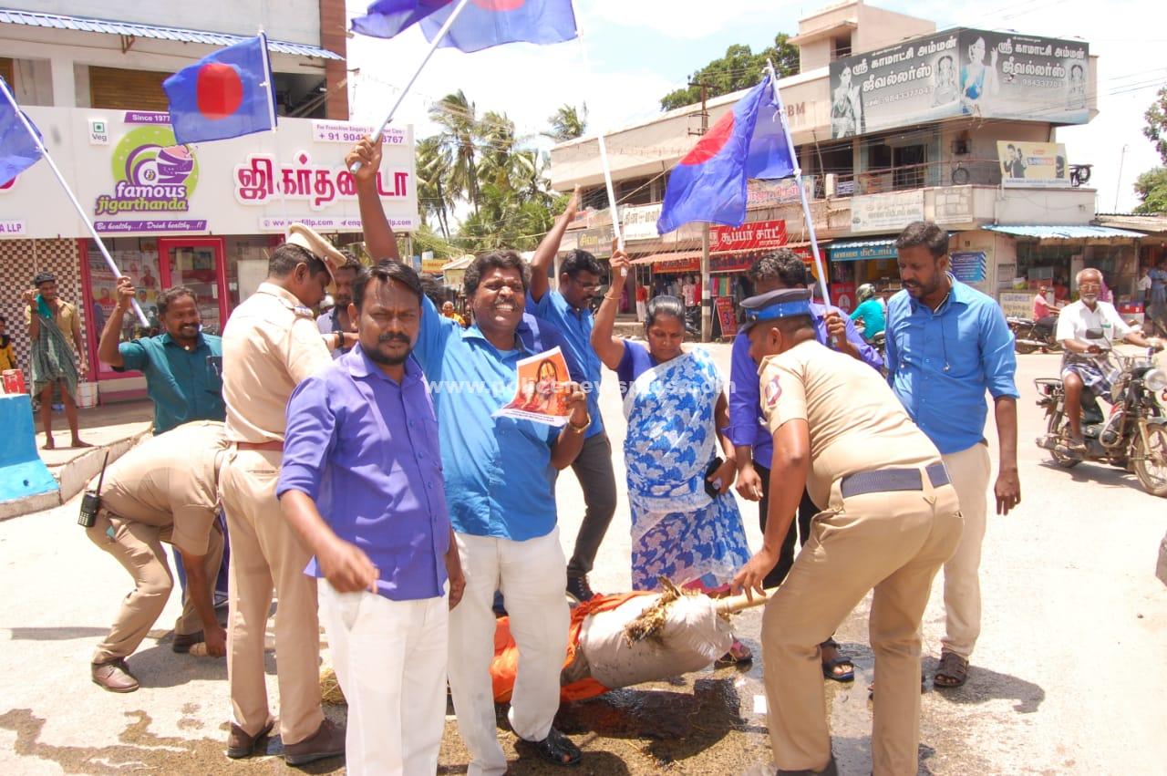 மாநில துணை பொது செயலாளர் கார்த்திக், தலித் ராஜா, வீரா செல்வம், மாவட்டச் செயலாளர் தமிழ் குமரன், மாநகர் மாவட்ட ச் செயலாளர் லட்சுமி சசிகுமார், மாவட்ட கொள்கை பரப்பு செயலாளர் அலங்கை சாந்தி, மேற்கு ஒன்றியச் செயலாளர் மணிகண்டன் உள்ளிட்டோர் கலந்து கொண்டனர். அலங்காநல்லூர் போலீஸார், உ.பி. சாமியார் உருவ பொம்மையை எரிக்க விடாமல், பறித்துப் சென்றனர்.