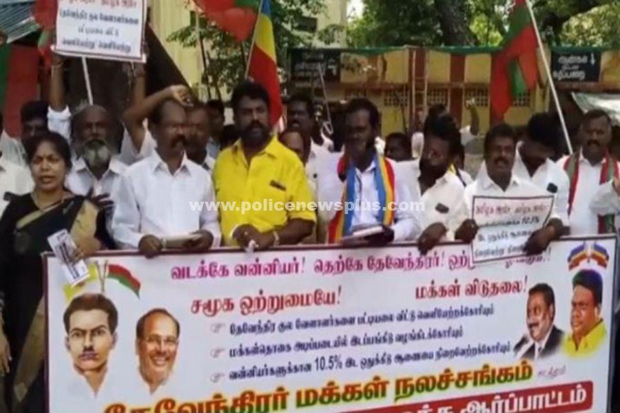 மதுரை : வன்னியர்களுக்கு, கல்வி மற்றும் வேலைவாய்ப்பில் 10.5 சதவீத இட ஒதுக்கீடு ஆணையை உடனடியாக நிறைவேற்ற வேண்டும் தேவேந்திரகுல வேளாளர்களை பட்டியலை விட்டு வெளியேற்றம் செய்ய வேண்டும் எனக் கூறி , பா.ம.க மற்றும் வன்னியர் சங்கம், தேவேந்திரர் மக்கள் நலச்சங்கம் சார்பில் மதுரை மாவட்ட ஆட்சியர் அலுவலகம் முன்பாக மாபெரும் கண்டன ஆர்ப்பாட்டம் நடைபெற்றது. மதுரை மாவட்ட ஆட்சியர் அலுவலகம் முன்பாக, சமூக ஒற்றுமையை வெளிப்படுத்தும் வகையில் , பாமக மற்றும் வன்னியர் சங்கம் தேவேந்திரர் மக்கள் நல சங்கம் சார்பில் தேவேந்திர குல வேளாளர்களை பட்டியலை விட்டு வெளியேற்றம் செய்ய வேண்டும் மக்கள் தொகை அடிப்படையில் இட பங்கீடு வழங்கிடவும் வன்னியர்களுக்கான 10.5% இட ஒதுக்கீட்டு ஆணையை உடனடியாக நிறைவேற்ற கோரியும், வன்னியர் சங்க மாநிலத் துணைத் தலைவர் நடராஜன் மற்றும் தேவேந்திரர் மக்கள் நலச் சங்கத் தலைவர் தேவேந்திரன் தலைமையிலும், கண்டன ஆர்ப்பாட்டம் நடைபெற்றது. இந்த ஆர்ப்பாட்டத்தில், பாமக பொதுச்செயலாளர் வடிவேல் ராவணன் மற்றும் பாமக பொருளாளர் திலகபாமா கலந்து கொண்டு, கண்டன உரையாற்றினார். இந்த ஆர்ப்பாட்டத்தில், பாமக மாவட்ட செயலாளர்கள் அழகர்சாமி, வீரக்குமார், பா.ம க மற்றும் வன்னியர் சங்கம் தேவேந்திர குல வேளாளர், தமிழர் தேசிய கழகம். மல்லர் பேரராயம். புதிய தமிழகம் கட்சி நிர்வாகிகள் உட்பட நூற்றுக்கும் மேற்பட்டோர் கலந்து கொண்டு கோரிக்கை முழக்கங்களை எழுப்பினர்.