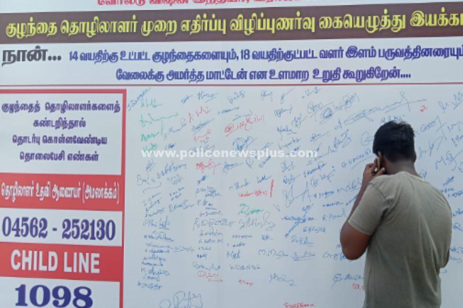 விருதுநகர் :  விருதுநகர் மாவட்டம், சிவகாசியில், மாவட்ட சட்டப்பணிகள் ஆணைக்குழு, தொழிலாளர் நலத்துறை சார்பில் அமைப்பு சாரா தொழிலாளர் நல வாரியங்கள் குறித்து விழிப்புணர்வு முகாம் நடைபெற்றது. மேலும் சட்டப்பணிகள் ஆணைக்குழு, தொழிலாளர் நலத்துறை மற்றும் ராஜபாளையம் வேர்ல்ட் விஷன் இந்தியா அமைப்பு சார்பாக, குழந்தை தொழிலாளர் முறை எதிர்ப்பு விழிப்புணர்வு கையெழுத்து இயக்கம் நடைபெற்றது. சிவகாசி பேருந்து நிலையத்தில் வைக்கப்பட்டிருந்த, விழிப்புணர்வு கையெழுத்து பதாகையில் பொதுமக்கள் மற்றும் சமூக ஆர்வலர்கள், குழந்தை தொழிலாளர் முறை எதிர்ப்பு விழிப்புணர்வு கையெழுத்திட்டு ஆதரவு தெரிவித்தனர். நிகழ்ச்சியில் மாவட்ட முதன்மை நீதிபதி கிறிஸ்டோபர், சிவகாசி கோட்டாட்சியர் விஸ்வநாதன், சார்பு நீதிபதிகள் இருதயராணி, முருகவேல்பாரதி, ராஜேஷ்கண்ணன் மற்றும் சமூகநல அமைப்பு நிர்வாகிகள் உட்பட பலர் கலந்து கொண்டனர்.