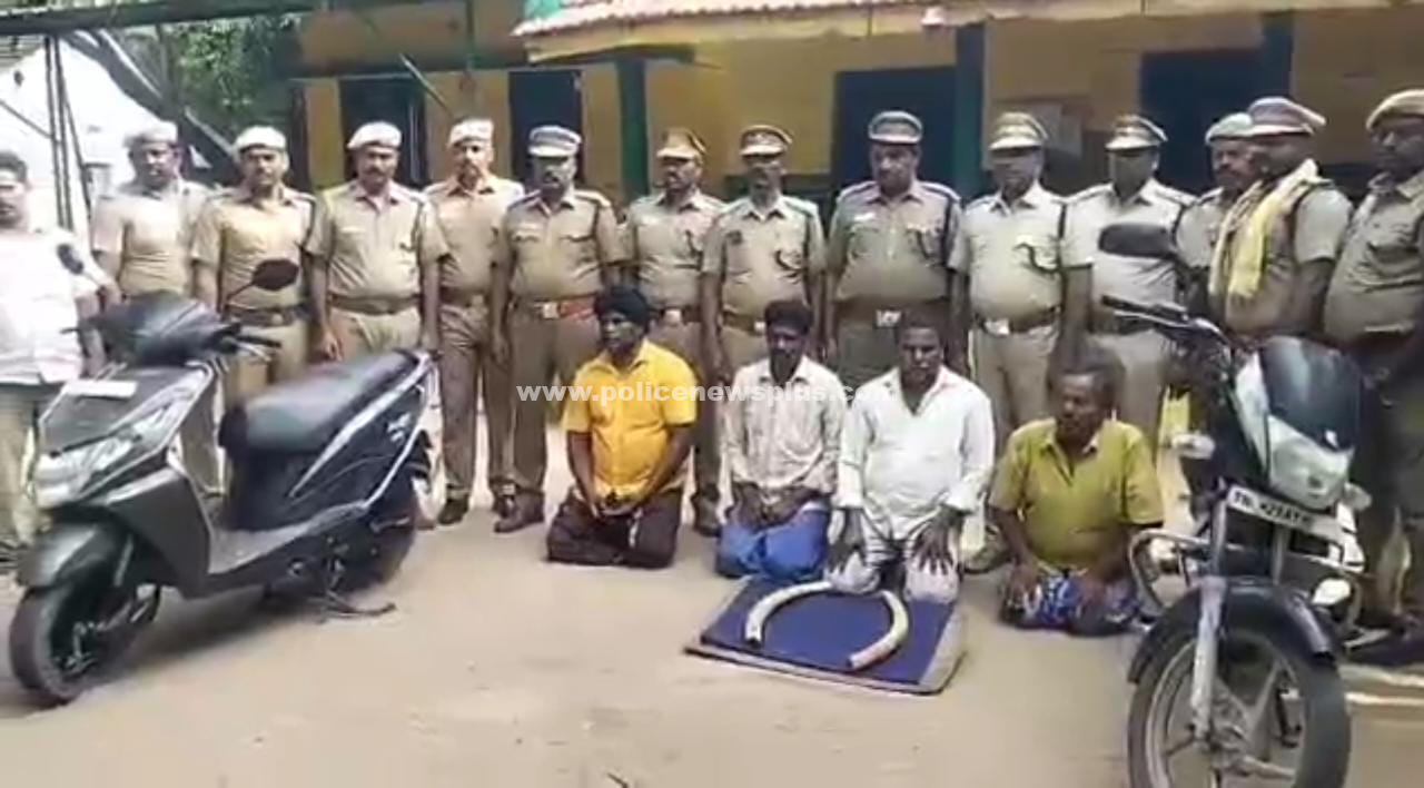 அவர்களை துரத்தி பிடித்த வனத்துறையினர் அவர்கள், பையை சோதனை செய்துள்ளனர். அப்போது, பையில் 2 யானை தந்தங்கள் இருந்தது கண்டுபிடிக்கப்பட்டது. உடனடியாக அவர்களிடம் இருந்து தந்தங்கள் கைப்பற்றப்பட்டு, கடத்தல் சம்பவத்தில் ஈடுபட்ட பாலகிருஷ்ணன், செந்தில், கந்தன்,நாகப்பன் ஆகிய 4 பேரையும் வனத்துறை அதிகாரிகள் கைது செய்தனர். இவர்கள் 4 பேரையும் நீதிமன்ற காவலில் வைக்க ஆஜர் படுத்தி, நடவடிக்கை மேற்கொள்ளப்பட்டது. மேலும் இந்த யானை தந்தங்கள் இவர்களிடம் எப்படி வந்தது, இந்த தங்கங்களை யாருக்கு விலை பேசினர் என்பது குறித்து தொடர்ந்து வனத்துறை அலுவலர்கள் விசாரணை நடத்தி வருகின்றனர்.