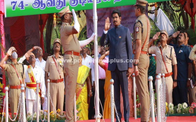 விழுப்புரம்: 74வது குடியரசு தின விழாவை முன்னிட்டு இன்று விழுப்புரம் மாவட்ட காவல் மைதானத்தில் மாவட்ட ஆட்சியர் திரு. த. மோகன், இ.ஆ.ப அவர்கள் தேசியக் கொடியை ஏற்றி வைத்து மரியாதை செலுத்தி ஆயுதப்படை காவல்துறையினரின் அணிவகுப்பு மரியாதையை ஏற்றார். விழுப்புரம் சரக காவல் துறை துணை தலைவர் திரு. பாண்டியன் IPS., அவர்கள், மாவட்ட காவல் கண்காணிப்பாளர் திரு. ஶ்ரீநாதா IPS., அவர்கள் முன்னிலை வகித்தார். விழுப்புரம் மாவட்ட ஆயுதப்படை காவல்துறையினரின் அணிவகுப்பு மரியாதையை ஏற்றுக்கொண்டார். விழுப்புரம் மாவட்ட ஆயுதப்படையினரின் அணிவகுப்பை காவல் ஆய்வாளர் திரு.முத்துகுமார் தலைமையில் கம்பீரமாக அணிவகுப்பு நடைபெற்றது. இதனையடுத்து தமிழ்நாடு காவல்துறையில் விழுப்புரம் மாவட்டத்தில் 10 வருடங்கள் சிறப்பாக பணிபுரிந்த 65 காவல்துறையினருக்கு தமிழ்நாடு முதலமைச்சர் அவர்களின் பதக்கம் வழங்கப்பட்டது. மேலும் மாவட்டத்தில் சிறப்பாக பணிபுரிந்த 30 காவல்துறையினருக்கு மாவட்ட ஆட்சியர் அவர்களின் பாராட்டுச் சான்றிதழ் வழங்கப்பட்டது.