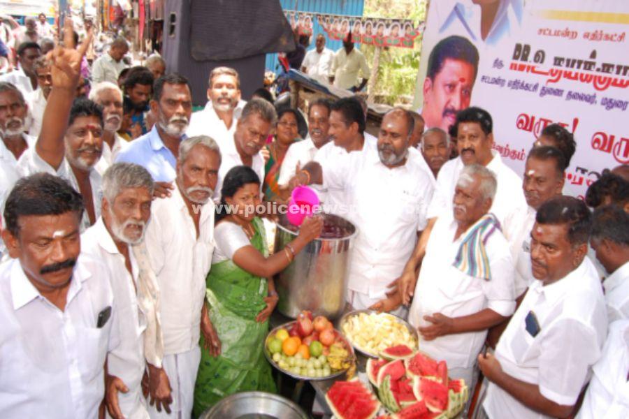 மதுரை : மதுரை மாவட்டம், அலங்காநல்லூரில் அதிமுக சார்பில் பொதுமக்களுக்கு நீர் மோர் பழங்கள் வழங்கும் நிகழ்ச்சி நடைபெற்றது. மதுரை மாவட்டம், அலங்காநல்லூரில் அதிமுக சார்பில் கோடை காலத்தில் இருந்து மக்களை காக்கும் வண்ணம் நீர்மோர் மற்றும் பழங்கள் வழங்கும் நிகழ்ச்சி நடைபெற்றது. இந்த நிகழ்ச்சிக்கு, ஒன்றியச் செயலாளர் கல்லணை ரவிச்சந்திரன் தலைமை தாங்கினார். நகரச் செயலாளர்கள் அழகுராஜ், குமார், வாடிப்பட்டி அசோக்குமார், ஆகியோர் முன்னிலை வகித்தனர். சிறப்பு விருந்தினராக கலந்து கொண்ட முன்னாள் வருவாய்த்துறை அமைச்சரும், திருமங்கலம் தொகுதி சட்டமன்ற உறுப்பினருமான ஆர்.பி. உதயகுமார் கலந்து கொண்டு சிறப்புரையாற்றினார். பின்னர், பொதுமக்களுக்கு அதிமுக பொதுச்செயலாளர் எடப்பாடி பழனிச்சாமி ஆணைக்கிணங்க நீர்மோர், சர்ப்பத் இளநீர் மற்றும் தண்ணீர்பழம், அண்ணாச்சிபழம், பலாப்பழம், ரோஸ்மில்க், உள்ளிட்டவைகளை வழங்கினார். இதில், முன்னாள் சட்டமன்ற உறுப்பினர் கருப்பையா, பேரூராட்சி கவுன்சிலர் நாட்டாமைசுந்தர், மற்றும் சுந்தரராகவன், முன்னாள் பேரூராட்சி கவுன்சிலர் பாஸ்கரன், வார்டு செயலாளர் வெள்ளை கிருஷ்ணன், இணைச் செயலாளர் புளியம்மாள், ஒன்றியக் கவுன்சிலர் ரேவதி, எம்ஜிஆர் இளைஞர் அணி எம்.எஸ். சுந்தரம், முன்னாள் ஊராட்சி மன்றத் தலைவர் முடுவார்பட்டி மாணிக்கம், ஊராட்சி மன்றத்