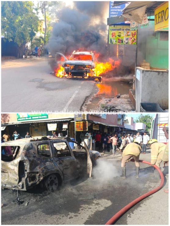 திருவள்ளூர் : திருவண்ணாமலை மாவட்டம் ஆரணியை நித்யா என்பவர் தமது குடும்பத்துடன் காரில் திருவள்ளூர் மாவட்டம் மீஞ்சூர் தேரடி தெருவில் உள்ள தமது உறவினர் வீட்டிற்கு வந்துள்ளார். மீஞ்சூர் வந்த போது காரில் திடீரென புகை வந்ததால் காரை விட்டு அனைவரும் இறங்கியுள்ளனர். அப்போது கார் திடீரென தீப்பற்றி எரிந்துள்ளது. கார் தீப்பற்றி எரிவதை கண்டு அதிர்ச்சியடைந்து தீயணைப்பு நிலையத்திற்கு தகவல் கொடுத்தனர். கார் தீப்பற்றிய நிலையில் உடனடியாக மின்சாரம் துண்டிக்கப்பட்டது. சுட்டெரித்த வெயிலில் கார் கொழுந்து விட்டு எரிந்த நிலையில் அருகில் இருந்த மின்சார பெட்டியும் தீயில் எரிந்தது.