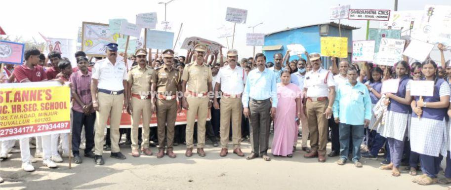 திருவள்ளூர்: ஆவடி மாநகர காவல் ஆணையர் உத்தரவின் பேரில் செங்குன்றம் போக்குவரத்து காவல்துறை சார்பில் மீஞ்சூரில் சாலை பாதுகாப்பு குறித்து விழிப்புணர்வு ஏற்படுத்தப்பட்டது. போக்குவரத்து காவல் ஆய்வாளர் சோபிதாஸ் தலைமையில் நடைபெற்ற இந்த நிகழ்வில் ஹெல்மெட் அணிய வேண்டும், சீட்பெல்ட் அணிய வேண்டும், மதுகுடித்துவிட்டு வாகனம் ஓட்ட கூடாது உட்பட சாலை பாதுகாப்பு விதிகள் எடுத்துரைக்கப்பட்டன. இதில் மீஞ்சூர் சுற்றுவட்டார பகுதிகளை சேர்ந்த 5பள்ளிகளின் மாணவர்கள் கலந்து கொண்டனர்.