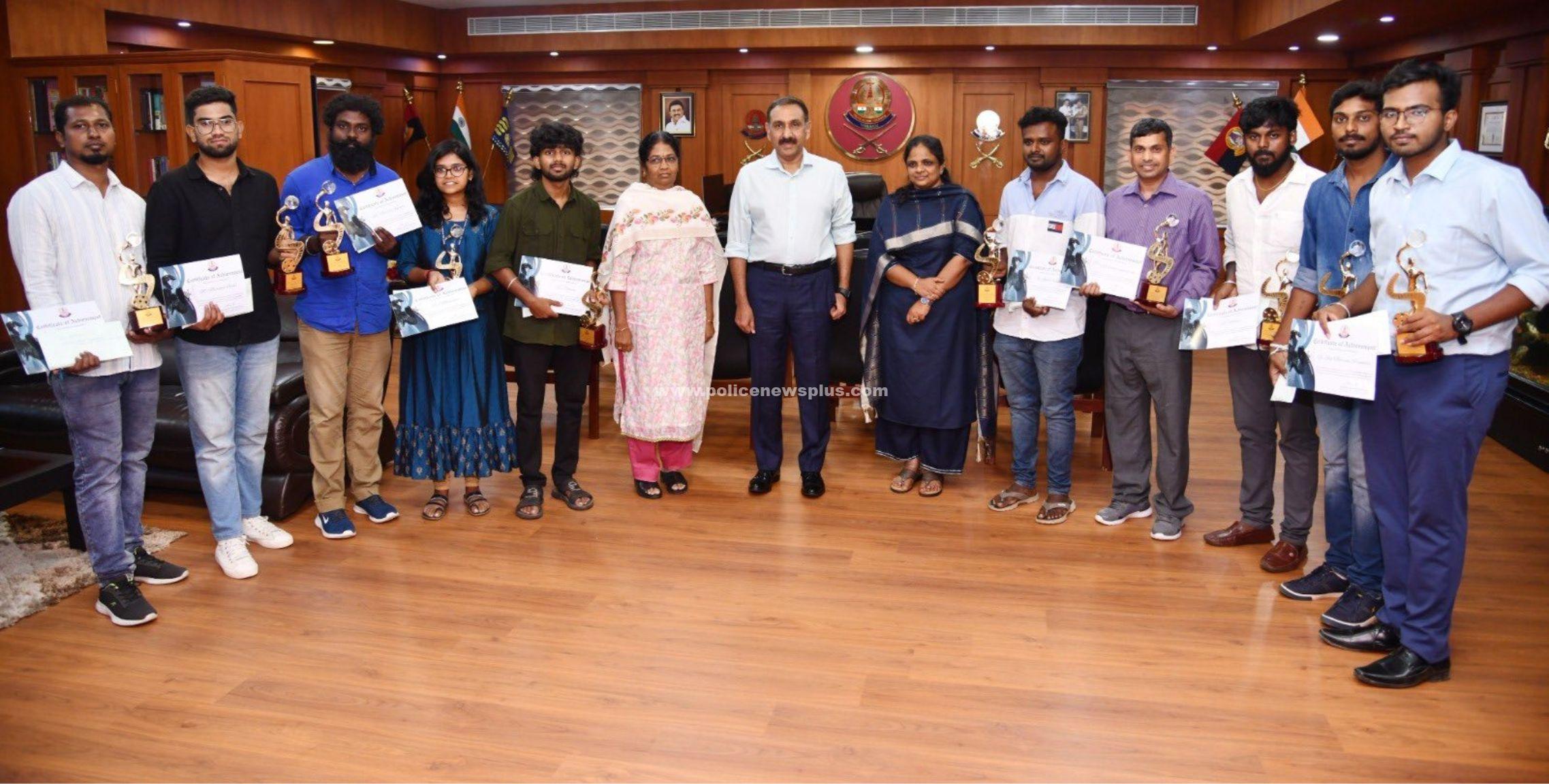 குறும்பட போட்டியில் வெற்றி பெற்றவர்களுக்கு சென்னை பெருநகர காவல் ஆணையர் அவர்கள் பரிசுத்தொகை மற்றும் சான்றிதழ்கள் வழங்கி பாராட்டினார்.