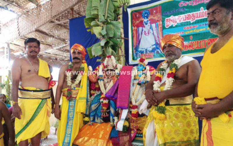 மதுரை : சோழவந்தான் அருள்மிகு திரவுபதிஅம்மன் கோவில் பூக்குழி திருவிழா கடந்த திங்கட்கிழமை கொடியேற்றத்துடன் தொடங்கியது. இதனைத் தொடர்ந்து திருவிழாவில் ஒரு பகுதியான திருக்கல்யாண நிகழ்ச்சி நடைபெற்றது. இந்நிகழ்ச்சியை முன்னிட்டு மேளதாளத்துடன் வடக்கு ரதவீதி வெள்ளாளர் உறவின்முறை சங்க தலைவர் சுகுமாரன் மற்றும் நிர்வாகிகள் உட்பட பெண்கள் சீர்வரிசை எடுத்து வந்தனர். பிரசாத் சர்மா தலைமையில் திருக்கல்யாண யாகபூஜை நடந்தது. பரம்பரை அறங்காவலர்கள் அர்ச்சுனன், திருப்பதி,ஜவஹர்லால்,குப்புசாமி ஆகியோர் மாப்பிள்ளை விட்டார், பெண்வீட்டாராக இருந்து திருமணத்தை நடத்தி வைத்தனர். அனைவருக்கும் திருமாங்கல்ய பிரசாதம், முன்னாள் நிர்வாக பரம்பரை அறங்காவலர் ஆதிமூலம்பிள்ளை குடும்பத்தினர் சார்பாக அன்னதானம் வழங்கப்பட்டது.பேரூராட்சி தலைவர் ஜெயராமன், கோவில் செயல் அலுவலர் இளமதி,முன்னாள் பேரூராட்சி தலைவர் எம் கே முருகேசன், பேரூராட்சி சுகாதார ஆய்வாளர் முருகானந்தம் மற்றும் கோவிலைச் சேர்ந்தவர்கள் உள்பட பக்தர்கள் ஏராளமானோர் கலந்து கொண்டனர்.