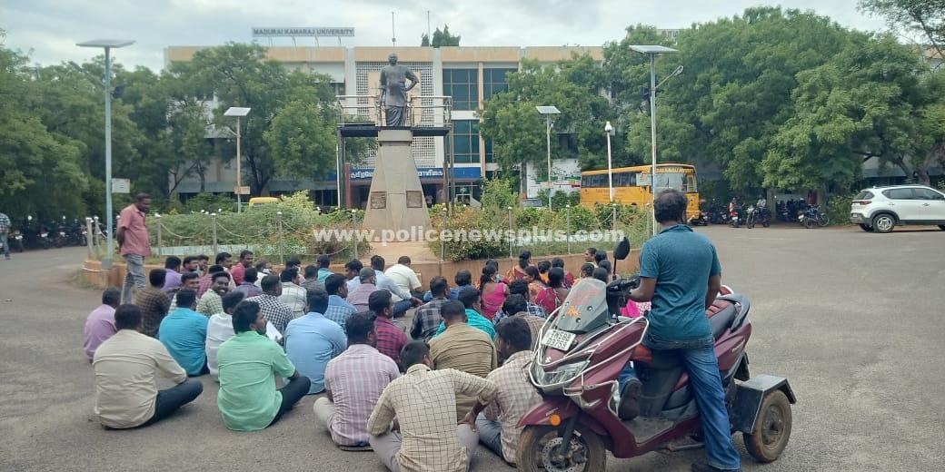 தொடர்ந்து, பல்கலைக்கழக , பதிவாளர் வசந்தா புகாரின் பேரில், நாகமலை, புதுக்கோட்டை, காவல் துறையினர், 136 கைது செய்து, என்.ஜி.ஓ. காலனியில் உள்ள திருமண மண்டபத்தில், 136 பேரை கைது செய்து தங்க வைத்துள்ளனர்.