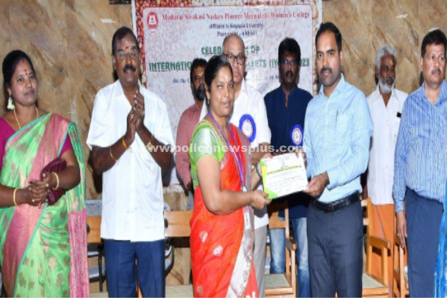 சிவகங்கை : சர்வதேச சிறுதானிய ஆண்டு-2023-யொட்டி, மதுரை சிவகாசி நாடார்கள் பயோனியர் மீனாட்சி பெண்கள் கல்லூரி கலையரங்கத்தில் சிவகங்கை மாவட்ட ஆட்சித்தலைவர் ப.மதுசூதன் ரெட்டி, துவக்கி வைத்து, பல்வேறு போட்டிகளில் வெற்றி பெற்ற கல்லூரி மாணவியர்கள் மற்றும் ஆசிரியைகளுக்கு பதக்கம் மற்றும் சான்றிதழ்களை வழங்கினார். மதுரை சிவகாசி நாடார்கள் பயோனியர் மீனாட்சி பெண்கள் கல்லூரி கலையரங்கத்தில், சர்வதேச சிறுதானிய ஆண்டு-2023-யொட்டி, மாவட்ட ஆட்சித்தலைவர் ப.மதுசூதன் ரெட்டி, துவக்கி வைத்து, பல்வேறு போட்டிகளில் வெற்றி பெற்ற கல்லூரி மாணவியர்கள் மற்றும் ஆசிரியைகளுக்கு பதக்கம் மற்றும் சான்றிதழ்களை வழங்கி தெரிவிக்கையில், தமிழ்நாட்டில் சிறுதானியங்கள் இயல்பாக 8.66 இலட்சம் எக்டர் பரப்பில் சாகுபடி செய்யப்பட்டு, 31.28 இலட்சம் மெ.டன் உற்பத்தி செய்யப்படுகின்றன. சோளம், கம்பு, கேழ்வரகு தினை, சாமை, வரகு, குதிரைவாலி ஆகிய சிறுதானியல்களின் பரப்பு.