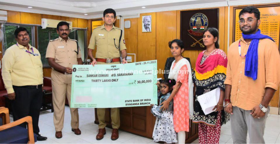 சிவகங்கை : சிவகங்கை மாவட்டம், ஆயுதப்படையில், வாகனப்பிரிவில் பணிபுரிந்த த.கா.290 திரு.சரவணன் என்பவர் கடந்த (17.3.2023)-ம் தேதி இரயில் விபத்தில் மரணமடைந்தார். SBI சார்பாக அவருடைய Salary Packge -ல் இருந்து ரூ.30,00,000/-(முப்பது இலட்சம்)அவருடைய மனைவி திருமதி.சங்கரேஸ்வரி அவர்களிடம் காவல் கண்காணிப்பாளர் திரு.B.K.அர்விந்த,இ.கா.ப., கூடுதல் காவல் கண்காணிப்பாளர், தலைமையிடம் மற்றும் SBI வங்கி முதன்மையாளர் ஆகியோர் முன்னிலையில் ஒப்படைக்கப்பட்டது.