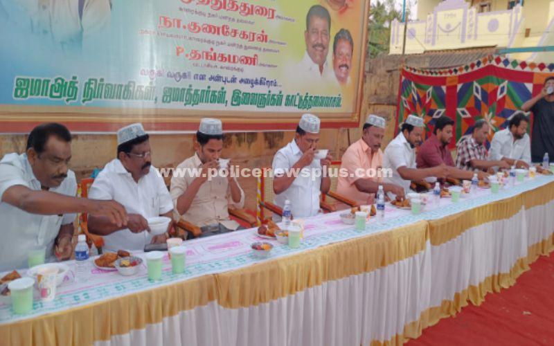 சிவகங்கை : சிவகங்கை மாவட்டம், காரைக்குடி காட்டுத் தலைவாசல் பள்ளிவாசலில் இப்தார் நோன்பு நிகழ்ச்சி காரைக்குடி நகர்மன்ற தலைவர் வணக்கத்திற்குரிய சே. முத்துத்துரை அவர்களின் தலைமையிலும் உயர்திரு. காவல் துறை உதவி கண்காணிப்பாளர் ஸ்டாலின் ஐ.பி.எஸ், அவர்களின் முன்னிலையில் காட்டுத்தலை வாசல் பள்ளிவாசலில் இப்தார் நோன்பு இன்று திறக்கப்பட்டது. உடன் நகர் மன்ற துணைத் தலைவர் வணக்கத்துக்குரிய ந. குனசேகரன் அவர்கள் நகர்மன்ற உறுப்பினர் ராணி சைதுன் சேட் அவர்கள் சோனா கண்ணன் அவர்கள் விஷ்ணு பெருமாள் அவர்கள் அவர்கள் மாவட்ட பிரதிநிதி சேவியர் அவர்கள் வட்டச் செயலாளர்கள் பாச்சா சாகிப் அவர்கள் முகமது கனி அவர்கள் மாணவரணி அசரப் அவர்கள் மற்றும் காட்டு தலை வாசல் பள்ளிவாசல் நிர்வாகிகள் மற்றும் பொதுமக்கள் கலந்து கொண்டனர்.