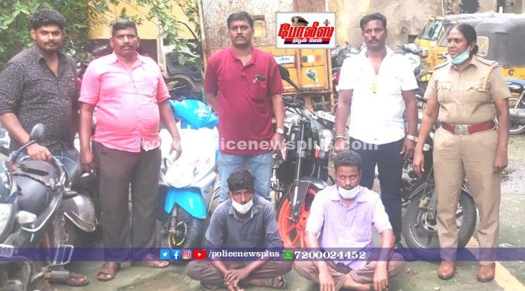 திருவொற்றியூர் காலடிப்பேட்டை பகுதியை சேர்ந்தவர் வசந்தன் இவர் திருவொற்றியூர் ரயில் நிலையம் அருகே உள்ள ரயில்வே முன்பதிவு மையத்தில் டிக்கெட் எடுக்க சென்றபோது வெளியே நிறுத்தி வைத்திருந்த இரு சக்கர வாகனத்தை காணவில்லை என திருவொற்றியூர் காவல் நிலையத்தில் புகார் அளித்திருந்தார் புகாரின் அடிப்படையில் சம்பவ இடத்திற்கு சென்று விசாரணை மேற்கொண்டு திருவொற்றியூர் குற்றப்பிரிவு ஆய்வாளர் புவனேஸ்வரி தலைமையிலான போலீசார் அப்பகுதியில் உள்ள கண்காணிப்பு கேமராவில் காட்சிகளை ஆய்வு மேற்கொண்டபோது திருவொற்றியூர் பூங்காவனபுரம் பகுதியை சேர்ந்த ஜெகன் மற்றும் காஜாமொய்தீன் ஆகிய 2 பேரும் திருட்டில் ஈடுபட்டது தெரியவந்ததையடுத்து அவர்கள் இருவரையும் கைது செய்த போலீசார் வழக்குப்பதிவு செய்து நீதிமன்றத்தில் ஆஜர்படுத்தி இருசக்கர வாகனத்தை பறிமுதல் செய்து சிறையில் அடைத்தனர்.