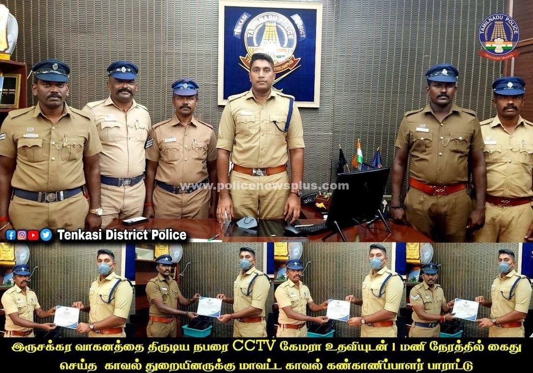 தென்காசி: தென்காசி மாவட்டம், கடையம் காவல் நிலைய எல்லைக்குட்பட்ட கீழ மாதாபுரம் பகுதியில் வசித்து வரும் யூதா பிராங்க்ளின் என்பவர் (26.02.2022) அன்று) கடையம் ஆட்டோ ஸ்டாண்ட் அருகே தனது இருசக்கர வாகனத்தை நிறுத்திவிட்டு கடைக்கு சென்று வருவதற்குள் அவரது இரு சக்கர வாகனத்தை யாரோ திருடிச் சென்று விட்டதாக கடையம் காவல் நிலையத்தில் கொடுத்த புகாரின் அடிப்படையில் கடையம் காவல் நிலைய முதல் நிலை காவலர்கள் திரு.ராஜா தனஞ்செயன், திரு. கிருஷ்ணகுமார் மற்றும் பாவூர்சத்திரம் காவல் நிலைய முதல் நிலைக் காவலர் திரு. குமரேச சீனிவாசன், காவலர்கள் திரு.வேல் குமார், திரு.மகேஷ் ஆகியோர் கடையம் முதல் பாவூர்சத்திரம் வரையிலான C.CTV கேமராக்களை ஆய்வு மேற்கொண்டு சென்று பாவூர்சத்திரம் காவல் எல்லைக்குட்பட்ட மெஞ்ஞானபுரம் பகுதியில் இரு சக்கர வாகனத்தை திருடிச் சென்ற சிவந்தி புரத்தைச் சேர்ந்த சண்முகவேல் என்பவரின் மகனான விக்னேஷ் @ பூரி கணேஷ் 23. என்ற நபரை மடக்கி பிடித்தனர்.இதுகுறித்து மேற்படி நபர் மீது சார்பு ஆய்வாளர் திரு. கோபால் அவர்கள் வழக்கு பதிவு செய்து கைது செய்து நீதிமன்ற காவலுக்கு உட்படுத்தி சிறையில் அடைத்தார். சிறப்பாக செயல்பட்டு குற்றவாளியை 1.30 மணி நேரத்தில் கைது செய்த காவல்துறையினரை மாவட்ட காவல் கண்காணிப்பாளர் திரு.கிருஷ்ணராஜ் IPS அவர்கள் நேரில் அழைத்து தனது வாழ்த்துக்களை கூறி பாராட்டுச் சான்றிதழ் வழங்கினார்..