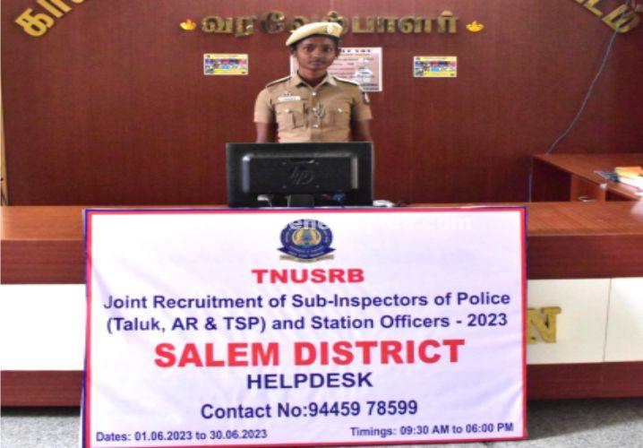 சேலம் : சேலம் தமிழ்நாடு சீருடை பணியாளர் தேர்வு வாரியம் அறிவித்துள்ள காவல் உதவி ஆய்வாளர், (தாலுகா ஆயுதப்படை மற்றும் தமிழ்நாடு சிறப்பு காவல் படை) பதவிகளுக்கான பொதுத்தேர்வு 2023 – க்கு இணையம் வாயிலாக விண்ணப்பிக்க வழி காட்டவும் சந்தேகங்களை தெளிவுபடுத்தவும் சேலம் மாவட்ட காவல் கண்காணிப்பாளர் திரு.சிவகுமார் அவர்களின் உத்தரவுப்படி மாவட்ட காவல் அலுவலகத்தில் உதவி மையம் துவங்கப்பட்டுள்ளது. தேர்வுக்கு விண்ணப்பிப்பது சம்பந்தமான உதவி வேண்டுகோள் நேரடியாகவோ அல்லது 94459 – 78599 என்ற தொலைபேசி வாயிலாக (1/06/2023) முதல் (30/6/2023), வரை காலை 9.30 மணி முதல் மாலை 6:00 மணி வரை உதவி மையத்தை நாடலாம்.