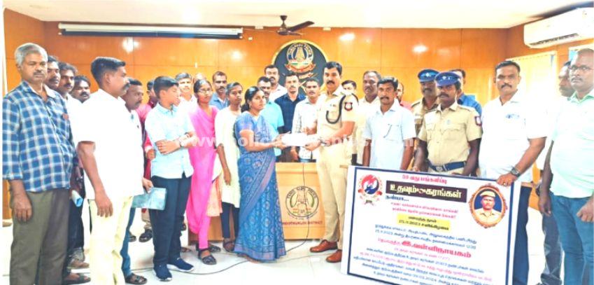 தூத்துக்குடி : தூத்துக்குடி மாவட்ட ஆயுதப்படை அலுவலகத்தில் பணியாற்றி வந்த தலைமை காவலர் தெய்வத்திரு. வள்ளிநாயகம் என்பவர் கடந்த (25.11.2023) அன்று மாரடைப்பால் காலமானார். மேற்படி வள்ளிநாயகம் அவர்களது குடும்பத்திற்கு தனிப்பட்ட முறையில் தங்களால் இயன்ற நிதியுதவி செய்ய வேண்டும் என்ற கருணையுள்ளத்தோடு, அவருடன் 2003ம் ஆண்டு காவலர் பணியில் சேர்ந்த தமிழகம் முழுவது உள்ள சக காவலர்கள் ஒன்று திரண்டு உதவும் கரங்கள் 2003 சார்பாக ரூபாய் 28,73,000/- பணம் நன்கொடையாக பெற்று, அவற்றை காப்பீட்டு பத்திரங்கள், வங்கி நிரந்தர வைப்புத் தொகைகள் மற்றும் ரொக்கமாகவும் இன்று (09.03.2024) தூத்துக்குடி மாவட்ட காவல்துறை அலுவலகத்தில் காவலர்கள் முன்னிலையில் மாவட்ட காவல் கண்காணிப்பாளர் டாக்டர் எல். பாலாஜி சரவணன் அவர்கள் வள்ளிநாயகம் அவர்களது குடும்பத்தினருக்கு வழங்கி ஆறுதல் கூறினார்.