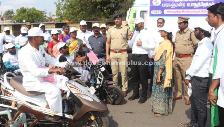 இந்திய தேர்தல் ஆணையமானது 2024-ம் ஆண்டு 18-வது மக்களவை தேர்தலுக்கான அட்டவணையினை வெளியிட்டுள்ளது. ஏப்ரல் 19-ம் தேதி அன்று தமிழகம் மற்றும் புதுச்சேரியில் வாக்குப்பதிவானது நடைபெறும் என அறிவிக்கப்பட்டுள்ள நிலையில் நாகை மாவட்டத்தில் 100 % வாக்கு செலுத்துதலின் அவசியத்தை முன்னெடுத்தும், நேர்மையாக வாக்கு செலுத்துதலின் முக்கியத்துவத்தை உணர்த்தும் வகையில் என் வாக்கு வாடகைக்கு அல்ல என்ற தலைப்பின் கீழ் நாகை மாவட்ட ஆட்சியர் திரு. ஜானி டாம் வர்கிஸ் இ. கா. ப அவர்களும், நாகை மாவட்ட காவல் கண்காணிப்பாளர் திரு. ஹர்ஷ் சிங் இ. கா.ப அவர்களும் கையெழுத்து இயக்கம் மற்றும் விழிப்புணர்வு பிரச்சாரத்தில் ஈடுபட்டனர். மேலும் இந்நிகழ்ச்சியில் மாற்றுத்திறனாளி ஆணையத்திலிருந்தும், மகளிர் திட்டம் அமைப்பில் இருந்தும் 100 க்கும் மேற்பட்ட மாற்றுத்திறனாளிகள் மற்றும் பெண்கள் விழிப்புணர்வு வாசகங்கள் பொருந்திய பதாகைகளுடன் பேரணியில் ஈடுபட்டனர். நாகை புதிய பேருந்து நிலையத்தில் தொடங்கப்பட்ட இந்த விழிப்புணர்வு பேரணியானது RDO அலுவலகத்திலும் அதனைத் தொடர்ந்து, மாவட்ட ஆட்சியர் அலுவலகத்தில் முடிக்கப்பட்டது.