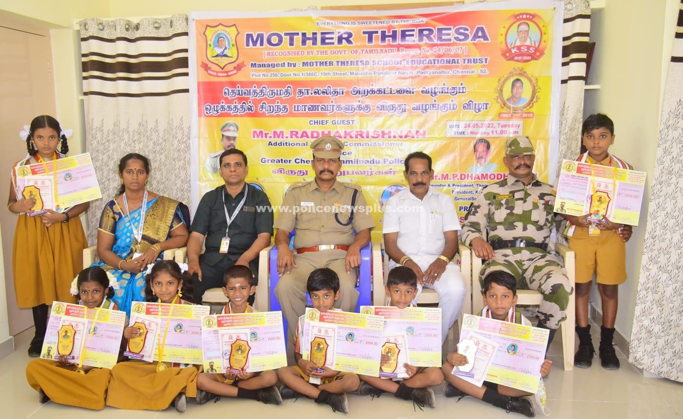 திருவள்ளூர் : திருவள்ளூர் மாவட்டம், செங்குன்றம் அடுத்த பாடியநல்லூரில், 18 ஆண்டுகளாக செயல்பட்டுவரும், மதர் தெரசா பள்ளியில், பயிலும் மாணவர்களில் ஒழுக்கத்தில் சிறந்த மாணவர்களாக 8 பேர் தேர்ந்தெடுக்கப்பட்டு அவர்களுக்கு தலா 2000, ரூபாய் வீதம் மீஞ்சூர் தெய்வத்தாய் லலிதா அறக்கட்டளை சார்பில், தலைவர் எம்.பி திரு. தாமோதரன், தலைமையில் (ஐஎன்டியூசி), சென்னை பெருநகர காவல்துறை கூடுதல் துணை கண்காணிப்பாளர் திரு. மு.ராதாகிருஷ்ணன், பரிசுத்தொகை மற்றும் சான்றிதழ், வழங்கினார்.
