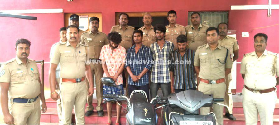 திண்டுக்கல்: திண்டுக்கல் மாவட்டம் பழனி காவல்துறை துணை கண்காணிப்பாளர் தனஜெயன் அதிரடி உத்தரவின் பேரில் காவல் ஆய்வாளர் மணிமாறன் வலியுறுத்தலின்படி. நகர காவல் சார்பு ஆய்வாளர் விஜய் மற்றும் காவலர்கள் ரோந்து பணிகள் ஈடுபட்டுக் கொண்டிருந்த பொழுது பழனி ஆண்டவர் கலைக்கல்லூரி அருகே சந்தேகத்தின் படி நின்று கொண்டிருந்த. அப்பர் தெருவை சேர்ந்த நாகேந்திர பிரசாத். புது நகர் மருது தட்டாங்குளம் பீட்டர் ஜீவன். தட்டாங்குளம் வெங்கடேசன். ஆகிய நான்கு நபர்களிடமிருந்து பள்ளி மற்றும் கல்லூரி மாணவர்களுக்காக விற்பனைக்கு வைக்கப்பட்டிருந்த 100 கிராம் கஞ்சா மற்றும் இருசக்கர வாகனங்கள் பறிமுதல் செய்து அவர்கள் மீது வழக்குப்பதிவு செய்து நீதிமன்றத்தில் ஆஜர் படுத்தி சிறையில் அடைக்கப்பட்டனர்.