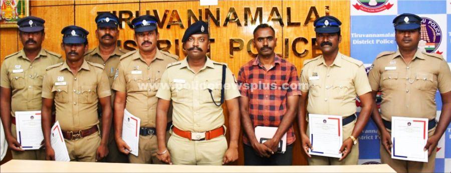 திருவண்ணாமலை : திருவண்ணாமலை மாவட்ட காவல் கண்காணிப்பாளர் மரு.கி.கார்த்திகேயன்.இ.கா.ப. அவர்கள், மாவட்டத்தில் கஞ்சா வழக்கில் குற்றவாளியை கைது செய்து அவரிடம் இருந்து சுமார் 2 கிலோ கிராம் கஞ்சாவை கைப்பற்றினார்கள். இதில் சிறப்பாக பணியாற்றிய தனிப்பிரிவு உதவி ஆய்வாளர் மற்றும் காவலர்களுக்கு பாராட்டு சான்றிதழினை வழங்கி சிறப்பித்து அவர்களை வெகுவாக பாராட்டினார.