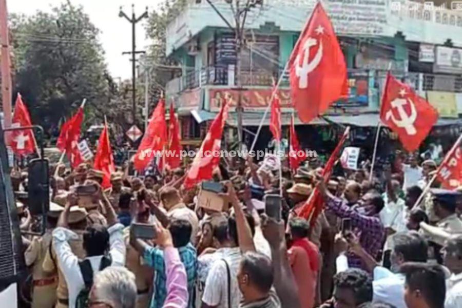 விருதுநகர் : விருதுநகர் மாவட்டம், ராஜபாளையம் ராஜுக்கள் கல்லூரியின் 50ம் ஆண்டு பொன்விழா நிகழ்ச்சி இன்று நடைபெறுகிறது. நிகழ்ச்சியில் தமிழக ஆளுநர் ஆர்.என்.ரவி கலந்து கொண்டு மாணவர்கள் மத்தியில் பேசுகிறார். ராஜபாளையம் நகருக்கு வருகை தந்த தமிழக ஆளுநருக்கு, மார்க்சிஸ்ட் கம்யூனிஸ்ட் கட்சியினர் எதிர்ப்பு தெரிவித்து கருப்பு கொடி காட்டுவதற்கு முயற்சி செய்தனர். ராஜபாளையம் காந்தி சிலை ரவுண்டான பகுதியில், கட்சியின் நகர செயலாளர் மாரியப்பன் தலைமையில் கம்யூனிஸ்ட் கட்சியினர் திரண்டு வந்து கோ பேக் ஆளுநர் என்று முழக்கமிட்டனர். தமிழக அரசு இயற்றிய