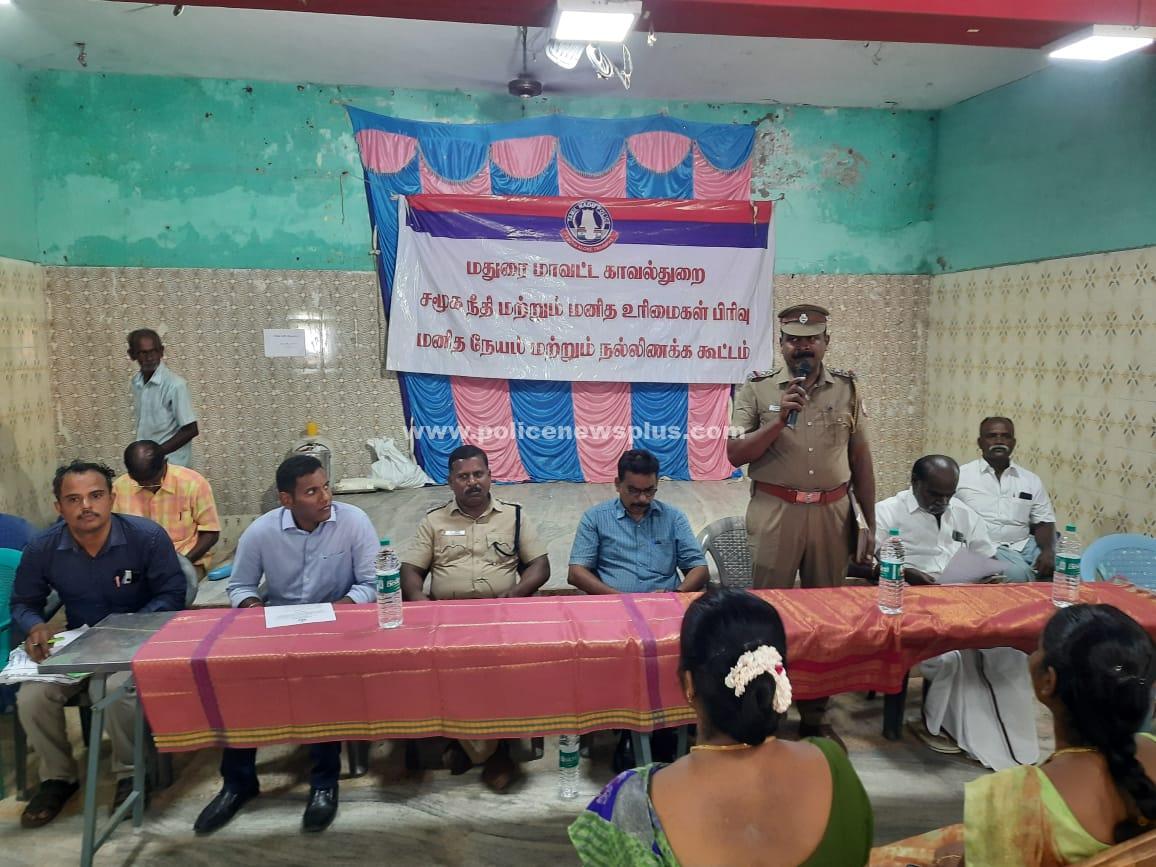 மதுரை : மதுரை மாவட்ட சமூக நீதி மற்றும் மனித உரிமைகள் பிரிவு மூலமாக (22.08.2023) அன்று கலைஞர் அவர்களின் நூற்றாண்டு விழாவினை முன்னிட்டு மதுரை தெற்கு வட்டம் சின்னமாங்குளம் கிராமத்திலும், மதுரை கிழக்கு வட்டம் விரகனூர் கிராமத்திலும் மற்றும் கள்ளிக்குடி வட்டம் மையிட்டான்பட்டி கிராமத்திலும் “ஒன்றிணைவோம்” என்ற பெயாில் விழிப்புணர்வு முகாம் நடைபெற்றது. இந்த விழிப்புணர்வு கூட்டத்தில் தீண்டாமை வன்கொடுமை தடுப்பு சட்டம் குறித்தும், தீண்டாமை வன்கொடுமை தடுப்பு விதிகள் பற்றியும், ஆதிதிராவிடர் மற்றும் பழங்குடியினர் நலத்துறை மூலமாக அரசு வழங்கும் நலத்திட்டங்கள் பற்றியும், போதை பொருள் தீமை பற்றியும், சிறார் திருமண தடுப்பு சட்டம் பற்றியும், பெண்கள் வன்கொடுமை தடுப்பு சட்டம் பற்றியும் எடுத்துரைக்கப்பட்டது. மேலும் தீண்டாமை ஒழிப்பு குறித்த வாசகங்கள் அடங்கிய துண்டு பிரசுரமும் பொது மக்களுக்கு வழங்கப்பட்டு சாதி மத பாகுபாடு இன்றி ஒற்றுமையுடன் வாழ வேண்டிய அவசியம் குறித்து பொதுமக்களுக்கு விழிப்புணர்வு எடுத்துரைக்கப்பட்டது. மேற்படி முகாமில் பல்வேறு துறைகளைச் சேர்ந்த அதிகாரிகள் மற்றும் பொதுமக்கள் கலந்து கொண்டனர் என்பது தெரிவித்துக் கொள்ளப்படுகிறது.