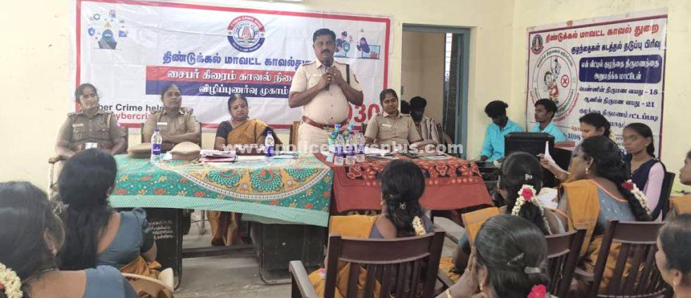 திண்டுக்கல்: திண்டுக்கல் ரெட்டியார்சத்திரம் கலை மற்றும் அறிவியல் கல்லூரியில் குழந்தைகள் கடத்தல் தடுப்பு பிரிவு மற்றும் சைபர் கிரைம் போலீசார் கல்லூரி மாணவிகளுக்கு விழிப்புணர்வை ஏற்படுத்தினர். இந்த நிகழ்ச்சிக்கு ஏ.டி.எஸ்.பி தெய்வம் தலைமை தாங்கினார்.இதில் குழந்தைகள் கடத்தல் தடுப்பு பிரிவு போலீஸ் இன்ஸ்பெக்டர் அமுதா, சைபர் கிரைம் போலீஸ் இன்ஸ்பெக்டர் விக்டோரியா லூர்து மேரி,சிறப்பு சப்-இன்ஸ்பெக்டர் மகாலட்சுமி மற்றும் பேராசிரியர்கள், மாணவ மாணவிகள் ஏராளமானோர் கலந்து கொண்டனர்.
