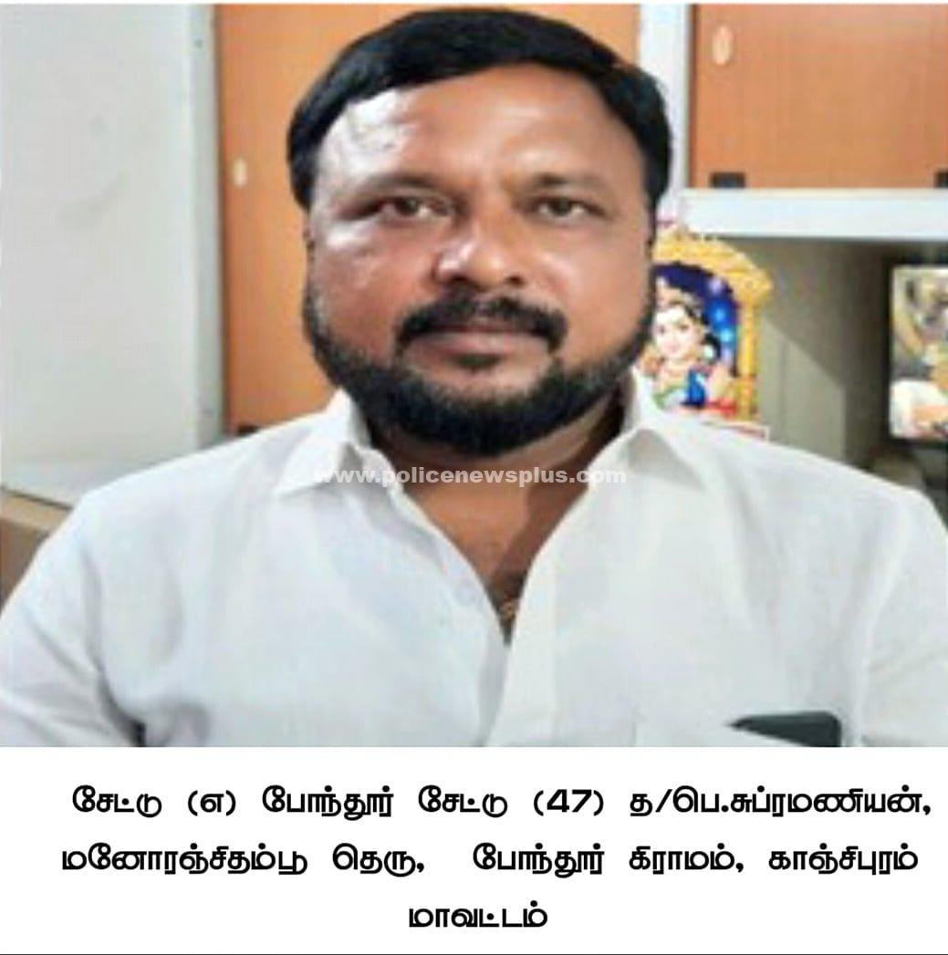 காஞ்சிபுரம் : காஞ்சிபுரம் மாவட்டத்தில் உள்ள ஸ்ரீபெரும்புதூர், காவல்நிலையத்தில் கொலை முயற்சி, மணல்திருட்டு போன்ற பல்வேறு வழக்கில் சம்மந்தப்பட்ட , குற்றவாளியான சேட்டு (எ) போந்தூர் சேட்டு (47), என்பவரை குண்டர் தடுப்புக காவல் சட்டத்தின், கீழ் தடுப்புக்காவலில் வைக்க காஞ்சிபுரம் மாவட்ட காவல் கண்காணிப்பாளர் திரு. Dr.M.சுதாகர், அவர்களின் பரிந்துரையின் பேரில் காஞ்சிபுரம் மாவட்ட ஆட்சியர் திருமதி. Dr.M.ஆர்த்தி, இ.ஆ.ப., அவர்கள் மேற்படி எதிரியை ஓராண்டு , தடுப்புக்காவலில் ( GOONDAS ) வைக்க அன்று ( 27.04.22 ), உத்தரவு பிறப்பித்தார்.