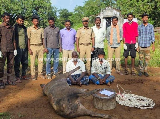 திண்டுக்கல்: திண்டுக்கல் மாவட்டம் ஒட்டன்சத்திரம் வனசரகம், சத்திரப்பட்டி பிரிவு கிழக்கு ஆயக்குடி கிராமம் கோம்பைபட்டி பகுதியில் வனத்துறையினர் ரோந்து சென்ற போது ரவிச்சந்திரன் என்பவருக்கு சொந்தமான தோட்டத்தில் கம்பியில் மின்சாரம் வைத்து காட்டுப்பன்றியினை வேட்டையாடிய தங்கவேல் மகன் ரவிச்சந்திரன், ரஞ்சித் குமார் மகன் சக்திவேல் (எ) மணிகண்டன் ஆகிய 2 பேரை வனத்துறையினர் கைது செய்து அவர்களிடமிருந்து காட்டுபன்றியை பறிமுதல் செய்து வழக்கு பதிவு செய்து விசாரணை மேற்கொண்டு வருகின்றனர்.