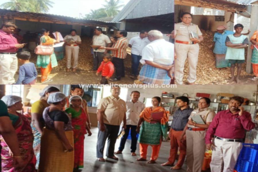 கரூர் மாவட்டத்தில் இயங்கி வரும் பல்வேறு விதமான தொழிற்சாலைகளில் ஆய்வு மேற்கொள்ளப்பட்டது. குழந்தை தொழிலாளர் உதவி ஆணையர் திரு.ராமராஜ், குழந்தை கடத்தல் தடுப்பு பிரிவு காவல் உதவி ஆய்வாளர் திருமதி.சித்ராதேவி மற்றும் முதல் நிலை பெண் காவலர் திருமதி. சாரதா மற்றும் மாவட்ட குழந்தை நல உறுப்பினர்கள் அகியோர் இணைந்து. மண்மங்கலம் மோதி நகரில் இயங்கி வரும் 1.அருண் ஸ்வீட் ஸ்டால் 2. மண்மங்கலம் N.புதூர் சாலையில் இயங்கி வரும் தரணி ஸ்வீட் ஸ்டால் 3. செல்லாண்டி பாளையத்தில் இயங்கி வரும் சரவணன் தேங்காய் மட்டை கம்பெனி மற்றும் 4.உழவர் சந்தையில் இயங்கி வரும் ஐயங்கார் பேக்கரியிலும் குழந்தை தொழிலாளர்கள் யாரேனும் பணியமர்த்தப்பட்டுள்ளனரா என ஆய்வு செய்யப்பட்டது.