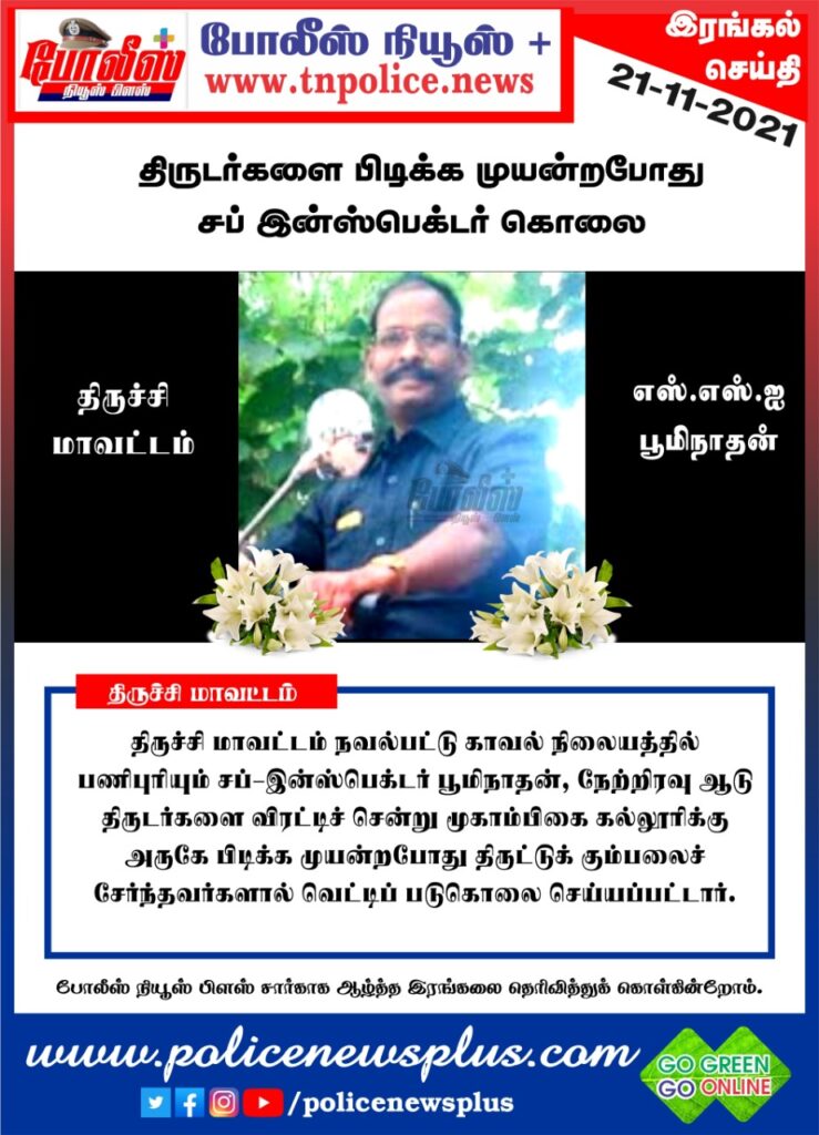 இந்நிலையில் திருடர்களை விரட்டி பிடிக்க சென்றபோது வெட்டிக்கொலை செய்யப்பட்ட உதவி ஆய்வாளர் பூமிநாதன் குடும்பத்திற்கு ஒரு கோடி நிவாரண மற்றும் குடும்பத்தில் ஒருவருக்கு அரசு வேலை அளிக்க இருப்பதாக முதல்வர் முக ஸ்டாலின் அறிவிப்பு வெளியிட்டுள்ளார்.