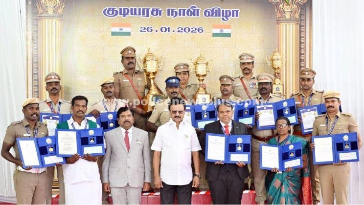 சென்னை : சென்னை காமராசர் சாலையில் நடைபெற்ற குடியரசு நாள் விழாவில், வீரதீரச் செயலுக்கான அண்ணா பதக்கங்கள், காந்தியடிகள் காவலர் பதக்கங்கள், கோட்டை அமீர் மத நல்லிணக்கப் பதக்கம், டாக்டர் நாராயணசாமி நாயுடு வேளாண்மை விருது, சிறந்த காவல் நிலையத்திற்கான முதலமைச்சரின் கோப்பைகள் உள்ளிட்ட பல்வேறு பதக்கங்கள் மற்றும் கோப்பைகள் வழங்கப்பட்டன. இந்த விருதுகளை பெற்றவர்கள், மாண்புமிகு தமிழ்நாடு முதலமைச்சர் திரு. M. K. Stalin அவர்களுடன் இணைந்து குழு புகைப்படம் எடுத்துக் கொண்டனர். இந்நிகழ்வு விழாவில் பங்கேற்றவர்களிடையே பெரும் மகிழ்ச்சியும் பெருமையும் ஏற்படுத்தியது.