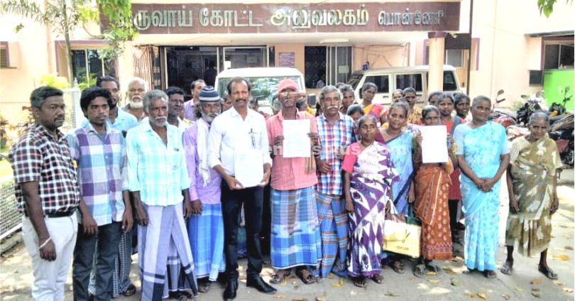திருவள்ளூர்: திருவள்ளூர் மாவட்டம், பொன்னேரி நகராட்சிக்குட்பட்ட 1வது வார்டு குன்னமஞ்சேரி இந்திரா நகரில் ஆரணி ஆற்றங்கரை ஒட்டிய நீர்நிலை அல்லாத பகுதியில் சுமார் 60க்கும் மேற்பட்ட தொழுநோயால் பாதிக்கப்பட்டவர்கள் மற்றும் அவர்கள் குடும்பத்தினர் பட்டா நிலத்தில் நெடுங்காலமாக வீடு கட்டி வசித்து வருகின்றனர். கடந்த நான்கு ஆண்டுகளுக்கு முன்பு இப்பகுதிக்கு அருகாமையில் இருக்கும் கிராமமான ஆரணி ஆற்றங்கரையின் எதிரில் இருக்கும் வைரவன் குப்பம் பகுதியில் அரசால் சவுடு மணல் எடுக்க அனுமதி வழங்கப்பட்டு அதன்படி அப்பகுதிக்கு செல்ல இப்பகுதி மக்கள் வசிக்கும் ஆற்றங்கரையை ஒட்டி கரையை கரைத்து கனரக லாரி வாகனங்கள் சென்றுவர அவர்களுக்கு பாதை ஏற்பாடு செய்து கொடுக்கப்பட்டது.