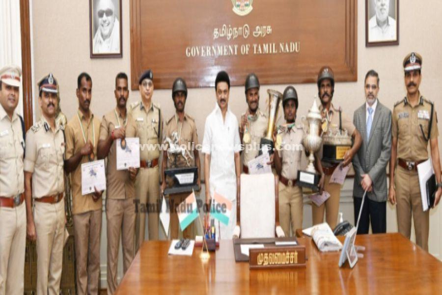 சென்னை : சென்னை மத்திய பிரதேச மாநிலத்தில் நடைபெற்ற 41ஆவது அகில இந்திய காவல்துறை குதிரையேற்ற சாம்பியன்ஷிப் மற்றும் குதிரையேற்ற காவல்துறைக்கான போட்டிகளில் பதக்கங்கள் மற்றும் கோப்பைகளை வென்ற தமிழ்நாடு காவல்துறை வீரர்கள் மாண்புமிகு முதலமைச்சர் திரு. மு. க. ஸ்டாலின், அவர்களை சந்தித்து வாழ்த்துப் பெற்றனர். இந்நிகழ்ச்சியில் தமிழ்நாடு காவல்துறை தலைமை இயக்குநர் /படைத்தலைவர் முனைவர் செ.சைலேந்திர பாபு, இ.கா.ப., அவர்கள் மற்றும் உயர் அதிகாரிகள் கலந்து கொண்டார்கள்.