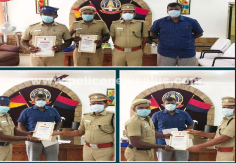 திண்டுக்கல் : 26.02.2022 திண்டுக்கல் மாவட்டம் அம்மையநாயக்கனூர் சரகத்தில் (25.02.2022) இரவு ரோந்து பணியின்போது சட்டவிரோதமாக நாட்டு துப்பாக்கி மற்றும் தோட்டாக்களை வைத்திருந்த நபர்களை கைது செய்தமைக்காக அம்மையநாயக்கனூர் தலைமை காவலர் திரு.பிரகாஷ் மற்றும் ஊர்காவல் படை காவலர் திரு.விஷ்ணுகுமார் ஆகிய இருவரையும் மாவட்ட காவல் கண்காணிப்பாளர் திரு.V.R.ஸ்ரீனிவாசன் அவர்கள் நேரில் அழைத்து வெகுமதி மற்றும் சான்றிதழ்கள் வழங்கி