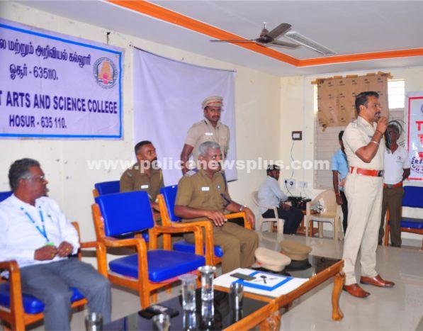 கிருஷ்ணகிரி : கிருஷ்ணகிரி மாவட்டம், ஓசூர் அரசு கலை மற்றும் அறிவியல் கல்லூரியில் மாணவர்களுக்கு தமிழ் நாடு போலீஸ் டிராஃபிக் வார்டன் கிருஷ்ணகிரி மாவட்டம் தலைவர் திரு.முத்துசாமி அவர்கள் தலைமையில் சாலை போக்குவரத்து பாதுகாப்பு மற்றும் போதை பொருள் தடுப்பு விழிப்புணர்வு நடத்தப்பட்டனர். இதில் சிப்காட் காவல் ஆய்வாளர் திரு.பிரகாஷ் அவர்கள் கலந்து கொண்டு மாணவர்களுக்கு விழிபுணர்வு கொடுத்தார். மேலும் கல்லூரி முதல்வர் மற்றும் ஆசிரியர்கள் கலந்து கொண்டு விழாவை சிறப்பித்தனர்.