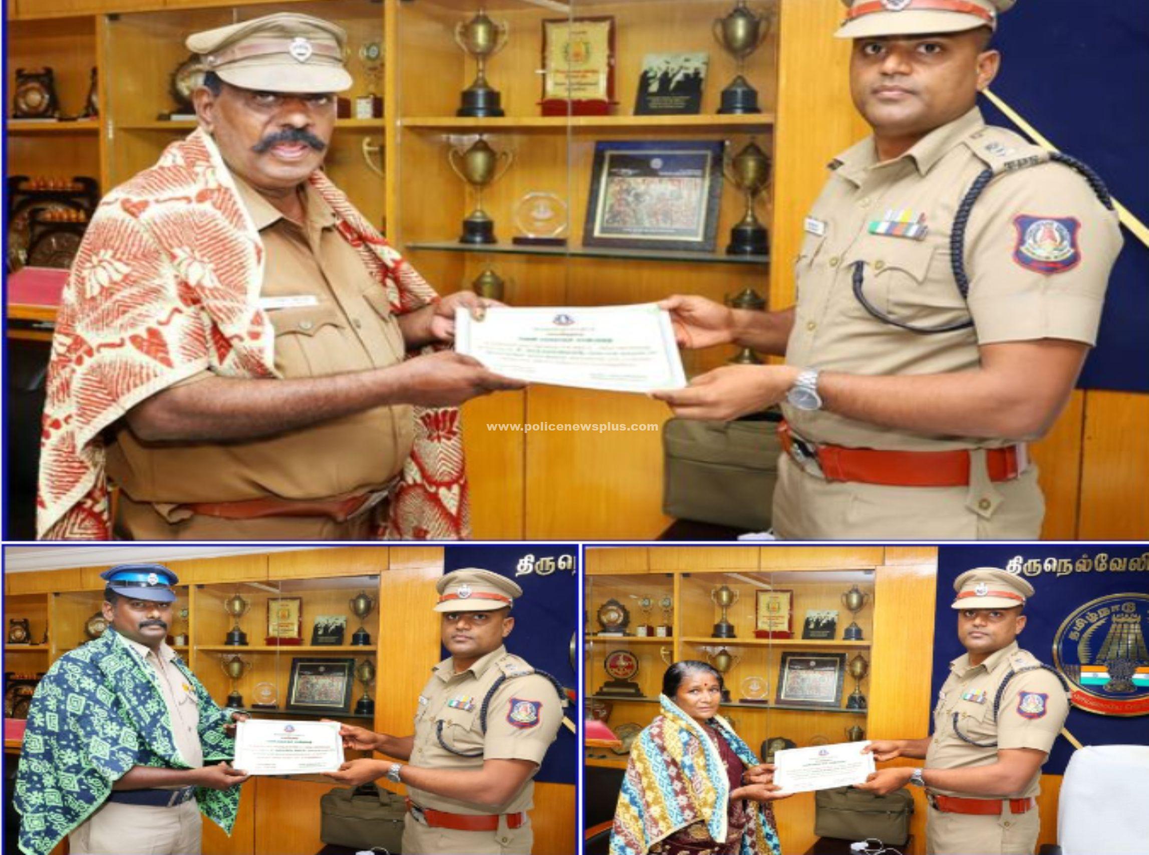 திருநெல்வேலி: தமிழக காவல்துறையில் 36 வருடங்கள் அமைச்சுப் பணியாளராக இருந்து சிறப்பான முறையில் பணிபுரிந்து ஓய்வு பெறும் அம்பாசமுத்திரம் காவல் நிலைய சிறப்பு உதவி ஆய்வாளர் திரு. செல்லபாண்டியன் அவர்கள் மற்றும் 20 வருடங்கள் பணி புரிந்து விருப்ப ஓய்வு பெறும் கூடங்குளம் காவல் நிலைய தலைமை காவலர் திரு. ஆரோக்கிய ஜேம்ஸ் அவர்கள் மற்றும் 15 வருடங்கள் ராதாபுரம் காவல் நிலையத்தில் துப்புரவு பணியாளராக இருந்து ஓய்வு பெறும் திருமதி. வெள்ளையம்மாள் அவர்கள் ஆகிய மூவருக்கும் மாவட்ட காவல் கண்காணிப்பாளர் அலுவலகத்தில் வைத்து சிறப்பான முறையில் பணியாற்றியதை பாராட்டி மாவட்ட காவல் கண்காணிப்பாளர் திரு. N. சிலம்பரசன்., அவர்கள் பொன்னாடை அணிவித்தும், பணி பாராட்டு சான்றிதழ் வழங்கி வாழ்த்துக்களை தெரிவித்தார்.