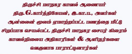 மேலும் இது போன்று ஆன்லைன் வாட்ஸ்அப், பேஸ்புக், இன்ஸ்டாகிராம் போன்ற ஆன்லைனில் வரும் நம்பி தங்களின் வங்கி கணக்கை யாரிடமும் பகிர்ந்து ஏமாற வேண்டாம் எனவும், யாரேனும் ஆன்லைன் மோசடி மூலம் பணத்தை இழந்து விட்டால் உடனே சைபர் கிரைம் அவசர உதவி எண்: 1930 அல்லது 155260- என்ற எண்களை விரைவாக தொடர்பு கொள்ளுமாறு புகார் அளிக்கலாம் எனவும், திருச்சி மாநகரில் இதுபோன்ற ஆன்லைன் மூலம் பணமோசடி ஈடுபடுவோர் மீது கடுமையான சட்டரீதியான நடவடிக்கை மேற்கொள்ளப்படும் எனவும் திருச்சி மாநகர காவல் ஆணையர் அவர்களால் தெரிவித்துக் கொள்ளப்படுகிறது.