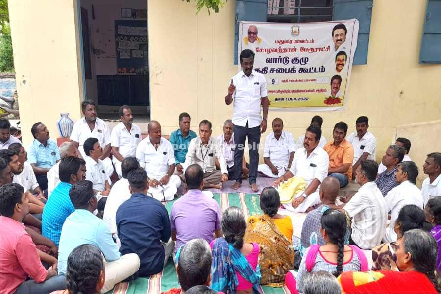 மதுரை: மதுரை மாவட்டம், சோழவந்தான் பேரூராட்சி சார்பில், பேரூராட்சிக்கு உட்பட்ட ஒன்பதாவது வார்டு பகுதியான சத்திரம் பள்ளியில் சபைக் கூட்டம் நடைபெற்றது. கூட்டத்திற்கு, சோழவந்தான் சட்டமன்ற உறுப்பினர் வெங்கடேசன் தலைமை தாங்கினார் .
