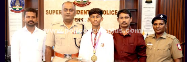 தென்காசி: ராஜஸ்தான் மாநிலத்தில் நடைபெற்ற தேசிய அளவிலான கராத்தே போட்டியில் புளியங்குடி அனைத்து மகளிர் காவல் நிலையத்தில் பணிபுரியும் பெண் தலைமை காவலர் திருமதி.சைலா அவர்களின் 9ம் வகுப்பு படிக்கும் மகன் முகில்வர்ஷன் என்பவர் போட்டியில் கலந்து கொண்டு தங்க பதக்கம் வென்றுள்ளார். இந்நிலையில் சிறுவனை பாராட்டும் விதமாக இன்று மாவட்ட காவல் கண்காணிப்பாளர் திரு.S.அரவிந்த் அவர்கள் முகில் வர்ஷனுக்கு பொன்னாடை அணிவித்து பாராட்டி மேலும் பல பதக்கங்களை வெல்ல தனது வாழ்த்துக்களை தெரிவித்தார்..