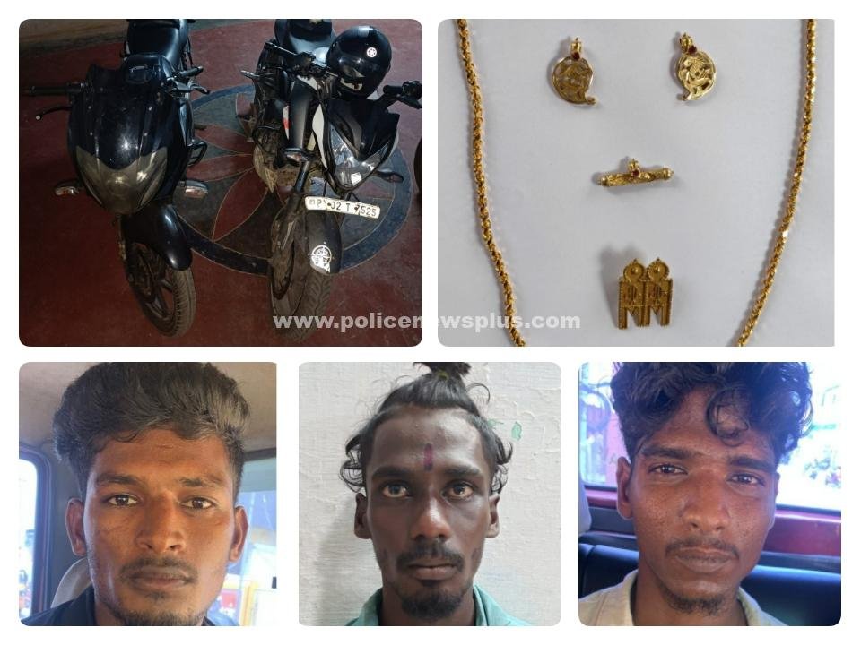 இதனை தொடர்ந்து இம்மூன்று நபர்களையும் தேடி வந்த நிலையில் தனிப்படை போலீசாருக்கு இவ்வழக்கில் சம்பந்தப்பட்ட குற்றவாளிகள் பூம்புகார் மற்றும் காரைக்காலில் மறைந்து இருப்பதாக ரகசிய தகவல் கிடைத்தது. அதனை தொடர்ந்து தனிப்படை போலீசார் உடனடியாக காரைக்கால் மற்றும் பூம்புகார் பகுதிகளுக்கு சென்று அங்கு மறைந்து இருந்த குற்றவாளிகளையும் அவர்கள் பயன்படுத்திய இருசக்கர வாகனங்கள் இரண்டு( ns200 மற்றும் பல்சர் 220 ) செல்போன்கள் மற்றும் சுமார் 12 பவுன் தாலி சங்கிலி ஆகியவைகள் பறிமுதல் செய்யப்பட்டு அவர்களை கைது செய்தார்கள். அதனை தொடர்ந்து குற்றவாளிகளிடம் தஞ்சை தாலுக்கா காவல் நிலைய ஆய்வாளர் திரு ஜெகதீசன் அவர்கள் மேலும் விசாரணை மேற்கொண்டு வருகிறார்கள்.