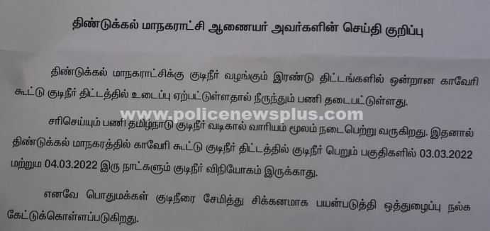 .. இதுகுறித்து மேலும் அவர் கூறியிருப்பதாவது: திண்டுக்கல் மாநகராட்சியில் பொதுமக்கள் 2 நாட்கள் பொறுத்து கொள்ளுமாறும் .புதிய குழாய்கள் சரி செய்யும் பணி போர்க்கால அடிப்படையில் நடைபெற்று வருவதாலும், பொதுமக்கள் ஒத்துழைப்பு தருமாறு அறிவுறுத்தி உள்ளார்.