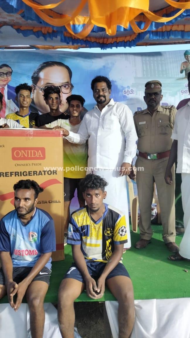 திருவள்ளூர்: மீஞ்சூர் அடுத்த தமிழ் கொரஞ்சூர், கிராமத்தில் டாக்டர் அம்பேத்கர், அவர்களின் 131 வது பிறந்த நாளை முன்னிட்டு கால் பந்தாட்ட போட்டி நடைபெற்றது. இதில் சிறப்பு அழைப்பாளராக, திராவிட முன்னேற்றக் கழகத்தின் திருவள்ளூர் கிழக்கு மாவட்ட சிறுபான்மையினர் நல அணி மாவட்ட அமைப்பாளர் எம். ஜி ராபர்ட் ராஜதுரை, கலந்துக் கொண்டு வெற்றி பெற்ற வீரர்களுக்கு பரிசுகளை வழங்கினார். உடன் மீஞ்சூர் காவல் உதவி ஆய்வாளர் குமார், மற்றும்கால் பந்தாட்ட வீரர்கள் பொதுமக்கள் பலர் கலந்து கொண்டனர்.