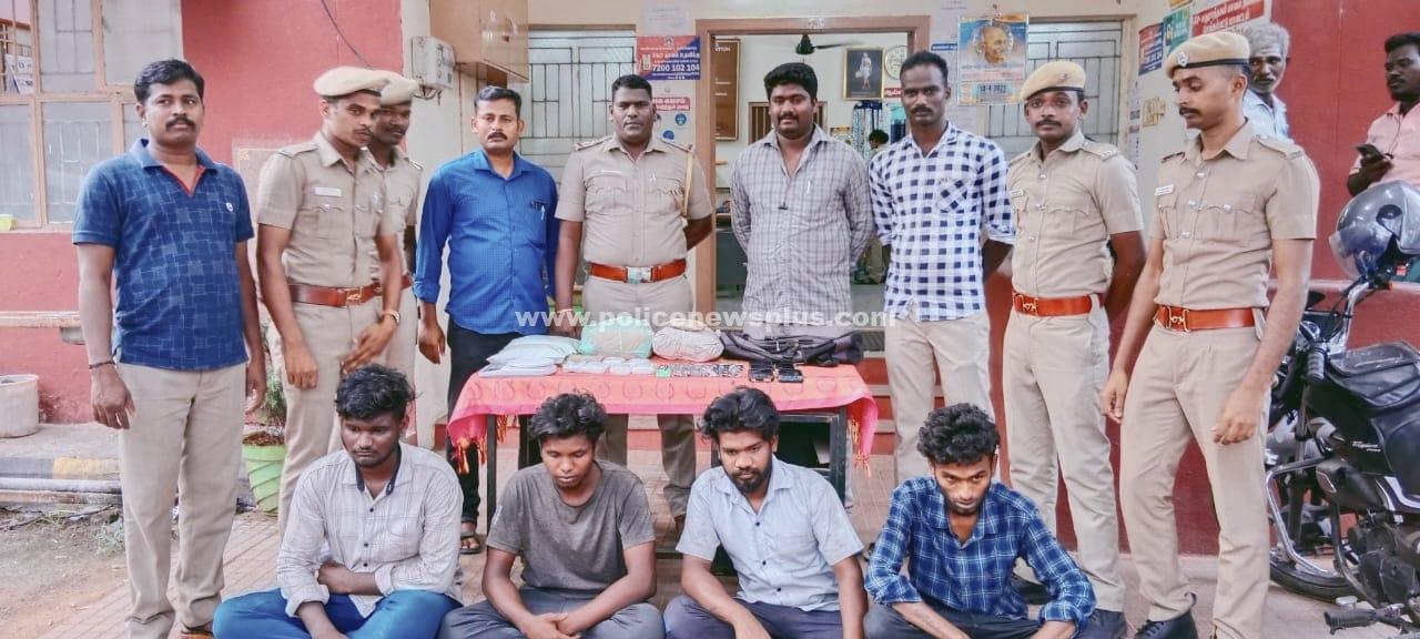 செங்கல்பட்டு: (13/04/2022), மதுராந்தகம் காவல்நிலையம், மலைபாளையம் பகுதியில் கஞ்சா விற்பனை செய்வதாக கிடைத்த ரகசிய தகவலின்படி, 1 கிலோ 100 கிராம் கஞ்சா விற்பனை செய்ய எடுத்து வந்த பிரபாகரன் (எ) பிரபா (21), பிரகாஷ் (21),கார்த்திக்(23), அக்பர் பாட்ஷா (22) நபர்கள் கைது செய்து நீதிமன்ற வழிகாவல் அனுப்பப்பட்டது.