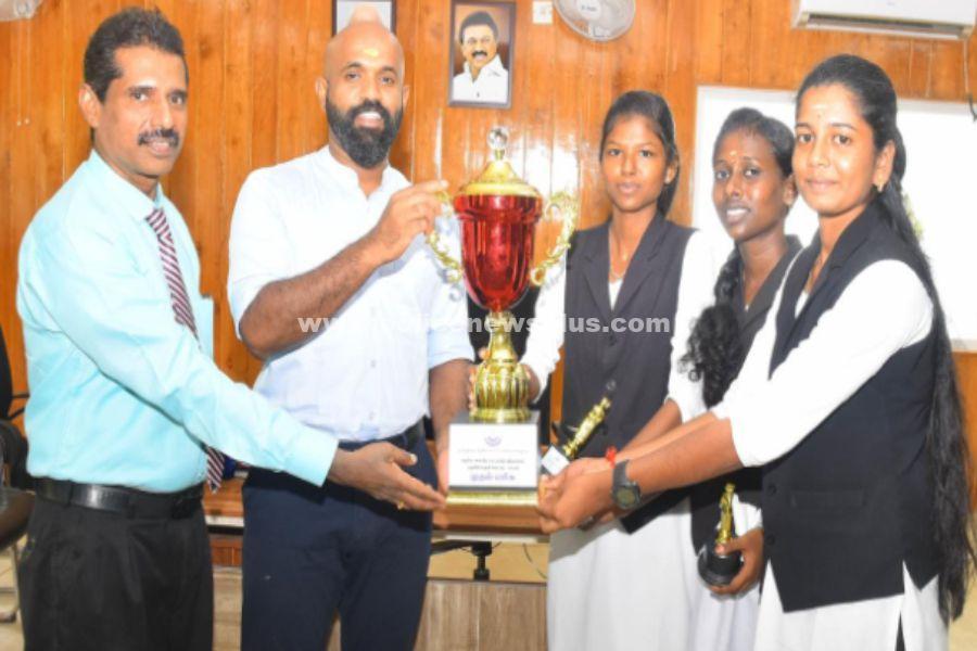 நடைபெற்ற அரசு சட்டக்கல்லூரி மாணவ, மாணவியர்களுக்கான போட்டியில் கலந்து கொண்டு இராமநாதபுரம் அரசு சட்டக்கல்லூரி மாணவிகள் ரம்யா, காவ்யதர்ஷினி, பொன்ராஜம் ஆகியோர், கொண்ட குழு சிறப்பாக செயல்பட்டமைக்காக முதல் பரிசு பெற்றதற்கு மாணவிகளை பாராட்டி வாழ்த்து தெரிவித்தவுடன் மேலும் மாணவிகளிடம் போட்டியின் விவரம் குறித்து கேட்டறிந்தார். அப்பொழுது மாணவிகள் தெரிவிக்கையில் திருச்சியில் மாநில அளவில் அரசு சட்டக் கல்லூரி மாணவ மாணவியர்களுக்கு தேசிய அளவிலான தமிழ் குற்றவியல் வழக்காடுதல் போட்டி 2023க்கு நடைபெற்றது. இப்போட்டியில் மூன்றுக்கும் மேற்பட்ட மாணவ,மாணவிகள் குழுவாக சேர்ந்து பங்கேற்பார்கள். அதனடிப்படையில் இராமநாதபுரம் அரசு சட்டக் கல்லூரியில் இருந்து நாங்கள் கலந்து