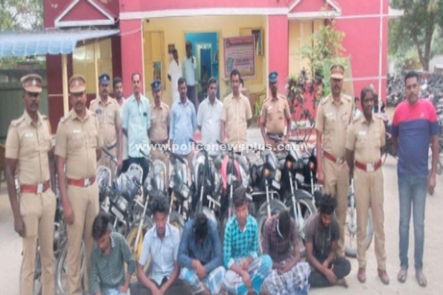 விழுப்புரம் : விழுப்புரம் மாவட்டம் அரகண்டநல்லூர் காவல் நிலைய எல்லைக்குட்பட்ட ஆற்காடு, அந்திலி பில்ராம்பட்டு ஆகிய பகுதிகளில் தொடர்ந்து இருசக்கர வாகனம் திருடு போவதாக கொடுத்த புகாரின் பேரில் மாவட்ட காவல் கண்காணிப்பாளர் திரு ஸ்ரீநாதா IPS., அவர்களின் உத்தரவின்படி துணை காவல் கண்காணிப்பாளர் திரு. பார்த்திபன் அவர்களின் மேற்பார்வையில் அரகண்டநல்லூர் காவல் நிலைய ஆய்வாளர் திருமதி சித்ரா, உதவி ஆய்வாளர் திரு அன்பழகன்,மற்றும் காவலர்கள் தலைமையில் தனிப்படை அமைத்து குற்றவாளிகளை தேடிய நிலையில் ஆலம்பாடி தணிக்கலாம்பட்டு கூட்ரோடு அருகே ரோந்து பணியில் இருந்தபோது சந்தேகத்திற்கு இடமாக நின்று கொண்டிருந்த நபர்களை காவல் நிலையம் அழைத்து வந்து விசாரணை செய்ததில் குற்றவாளிகள்: 1. மணிகண்டன், 2. சரவணன், 3. மாணிக்கம், 4. ஆனந்தன், 5. அன்பரசு, 6. தங்க பாண்டியன். மேற்கண்ட குற்றவாளிகளிடம் இருந்து 2 Pulsar, 9 splender என 11 இருசக்கர வாகனங்கள் கைப்பற்றப்பட்டு நீதி மன்ற காவலுக்கு அனுப்பப்பட்டது.