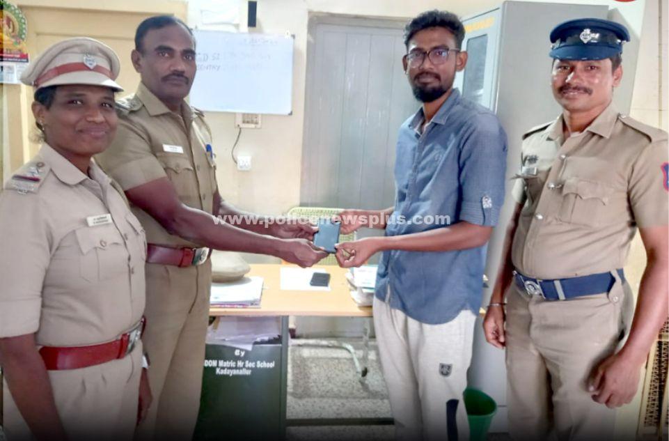 தென்காசி : கடையநல்லூர் காவல் நிலைய எல்லைக்குட்பட்ட மேலக்கடைய நல்லூர் பகுதியை சேர்ந்த ஜெயராஜ் என்பவரின் மகன் துரைராஜ் என்பவர் சொந்த வேலை காரணமாக இருசக்கர வாகனத்தில் கடையநல்லூர் வந்தபோது வழியில் அவரது செல்போன் தவறி கீழே விழுந்தது தொலைந்து விட்டதாகவும், தொலைந்த செல்போனை மீட்டுத் தருமாறு காவல் நிலையத்தில் கொடுத்த புகாரின் பேரில் காவல் ஆய்வாளர் திரு. ராஜா அவர்களின் அறிவுறுத்தலின் பேரில் சார்பு ஆய்வாளர் திருமதி. முருகேஸ்வரி மற்றும் காவலர் திரு.ராஜா ஆகியோர் இணைந்து தொலைந்த செல்போனை 30 நிமிடத்திற்குள் மீட்டு காவல் ஆய்வாளர் அவர்கள் முன்னிலையில் உரிய நபரிடம் ஒப்படைக்கப்பட்டது. தொலைபேசியை பெற்றுக்கொண்ட நபர் தென்காசி மாவட்ட காவல் துறைக்கு தனது நெஞ்சார்ந்த நன்றியினை தெரிவித்தார்.