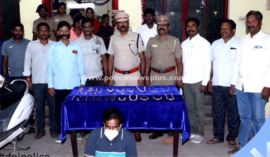 தர்மபுரி : தர்மபுரி நகர காவல் நிலைய எல்லைக்குட்பட்ட பாரதிபுரம் குமரபுரி பகுதியில் கடந்த (04.11.2023) ம் தேதி இரவு சிவராமகிருஷ்ணன் என்பவரது வீட்டின் கதவை உடைத்து சுமார் 58 3/4 சவரன் தங்க நகைகள் திருடப்பட்டது. மேலும் தொடர்ச்சியாக 18.11.2023 ம் தேதி அதியமான் கோட்டை காவல் நிலைய பகுதியில் சுமார் 12 சவரன் தங்க நகைகளும், சேலம் மாவட்டம் சூரமங்கலம் காவல் நிலைய எல்லைப்பகுதியில் சுமார் 14 சவரன் தங்க நகைகளும் என மொத்தம் 84 3/4 சவரன் தங்க நகைகள் திருடப்பட்டன. இதன் தொடர்ச்சியாக சம்பவயிடத்தை தர்மபுரி மாவட்ட காவல் கண்காணிப்பாளர் அவர்கள் பார்வையிட்டு அவர்கள் உத்தரவுபடி தர்மபுரி உட்கோட்டதுணை காவல் கண்காணிப்பாளர் திரு. செந்தில்குமார் அவர்களின் மேற்பார்வையில் காவல் ஆய்வாளர் திரு.ரங்கசாமி, காவல் உதவி ஆய்வாளர்கள் திரு.விஜயசங்கர், திரு.சென்றாயன் ஆகியோர் தலைமையில் தனிப்படை அமைக்கப்பட்டு தர்மபுரி சேலம், கிருஷ்ணகிரி ஆகிய பகுதிகளில் சுமார் 300 க்கும் மேற்பட்ட CCTV பதிவுகளை ஆய்வு செய்து ஆந்திர மாநிலம் குண்டூர் மாவட்டத்தைச் சேர்ந்த ராயப்பாடி வெங்கையா, வயது (47). த/பெ. புட்சையா, என்பவரை (13.12.2023_) ம் தேதி கைது செய்து அவரிடமிருந்து சுமார்80 3/4 சவரன் தங்க நகைகள் (சுமார் 32 லட்சம்) கைப்பற்றப்பட்டது. மேலும் வழக்கில் சம்பந்தப்பட்ட TATA HEXA கார் ஒன்றும் Honda Activa இருசக்கர வாகனம் ஒன்றும் கைப்பற்றப்பட்டது.