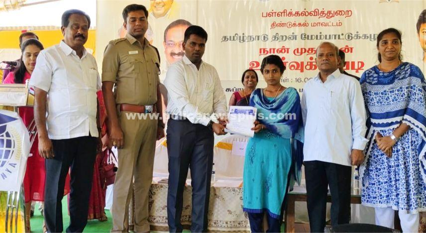 திண்டுக்கல்: திண்டுக்கல் மாவட்டம் பழனியில் பள்ளிக்கல்வித்துறை திண்டுக்கல் மாவட்டம் தமிழ்நாடு திறன் மேமர்பாட்டுக் கழகம் நான் முதல்வன் உயர்வுக்கு படி நிகழ்ச்சி சுப்ரமண்யா கலை மற்றும் அறிவியல் கல்லூரி நடைபெற்றது. இந்நிகழ்ச்சியின் சிறப்பு அழைப்பாளர்களாக பழனி சார் ஆட்சியர்.கிஷன் குமார் நகர் துணை கண்காணிப்பாளர். தனஜெயம் மற்றும் சுப்ரமணியம் கல்லூரியின் சுப்பிரமணி மற்றும் கல்வி துறை அதிகாரிகள் பலரும் கலந்துகொண்டு குடும்ப சூழ்நிலை காரணமாக உயர்கல்வி படிக்க முடியாத மாணவ, மாணவிகளுக்கு, உயர்கல்வி படிக்க அரசு சார்பில் ஊக்கத் தொகையுடன் படிக்க ஏற்பாடு செய்யப்பட்டு அதற்கான ஆணையை மாணவர்களுக்கு வழங்கினர்.