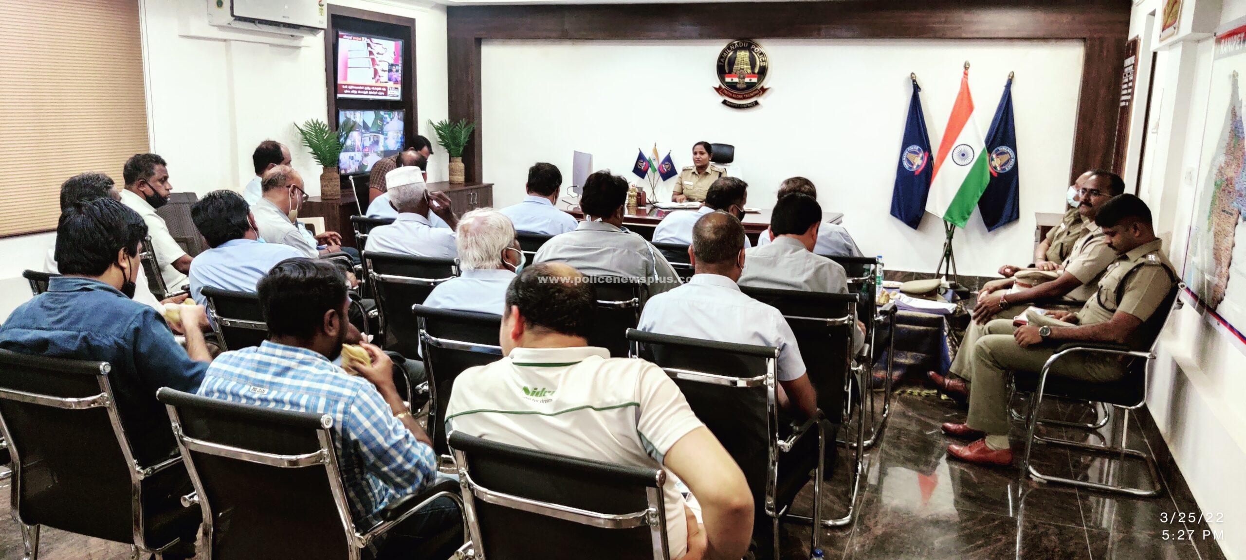 ராணிப்பேட்டை: ராணிப்பேட்டை மாவட்ட காவல் கண்காணிப்பாளர்D.R. தீபா சத்தியன் இ.க .ப. அவர்களின் தலைமையில் இன்று மாவட்ட காவல் அலுவலகத்தில் மாவட்டத்தில் உள்ள தொழிற்சாலை நிர்வாகிகள் கலந்தாய்வு கூட்டம் நடைபெற்றது இக்கூட்டத்தில் தொழிற்சாலைகளில் பின்பற்ற வேண்டிய பாதுகாப்பு ஏற்பாடுகள் தொழிற் சாலைகளில் பணிபுரியும் பெண்களின் பாதுகாப்பு குழந்தை தொழிலாளர் முறை ஒழிப்பு பெருகிவரும் சைபர் குற்றங்கள் குறித்த விழிப்புணர்வு அளிக்கப்படுவதோடு புலம்பெயர் தொழிலாளர்கள் தொடர்பான பிரச்சனைகள் குறித்தும் விவாதிக்கப்பட்டது. மேலும் தொழிற்சாலைகள் மற்றும் அதனை சுற்றியுள்ள பகுதிகளில் சிசிடிவி கேமராக்கள் அமைப்பின் முக்கியத்துவம் குறித்து விவாதிக்கப்பட்டது.