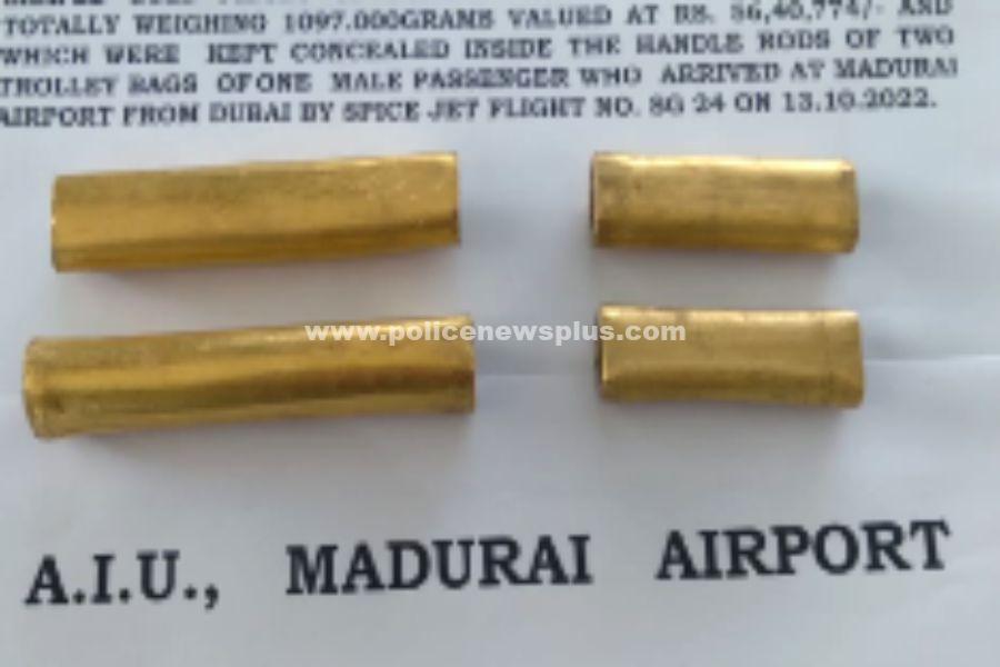 மதுரை : துபாயிலிருந்து மதுரை வரும் விமானத்தில், தங்கம் கடத்தப்படுவதாக வந்த தகவலை எடுத்து சுங்க இலக்க நுண்ணறிவு பிரிவினர் தீவிர சோதனையில் ஈடுபட்டனர். அப்போது சந்தேகத்திற்குரிய ஒரு நபர் டிராலி பேக்கில் மறைத்து வைக்கப்பட்ட மின்விசிறியில் 4 சிறிய காலி குழாய் .வடிவிலானவற்றை மறைத்து வைத்து கொண்டுவந்ததை கண்டுபிடித்தனர். ரூபாய் 56 லட்சத்து 40 ஆயிரத்து 777 மதிப்புள்ள சுமார் ஒரு கிலோ 90 கிராம் தங்கம் கைப்பற்றப்பட்டது.