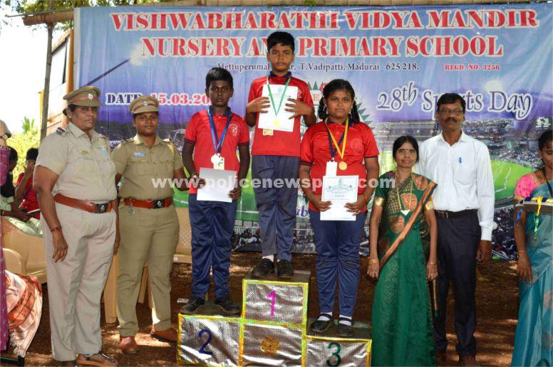 மதுரை: மதுரை மாவட்டம் வாடிப்பட்டி தாதம்பட்டி மேட்டுப் பெருமாள் நகர் விஷ்வ பாரதி வித்யா மந்திர் ஆங்கில நர்சரி பிரைமரி பள்ளி 28 ஆம் ஆண்டு விளையாட்டு விழா நடந்தது. இந்த விழாவிற்கு போலீஸ் இன்ஸ்பெக்டர் வளர்மதி தலைமை தாங்கி தேசிய கொடியேற்றி அணிவகுப்பு மரியாதை ஏற்று விளையாட்டு போட்டிகளை தொடக்கி வைத்தார். முதல்வர் எஸ் எஸ் குபேந்திரன் வரவேற்றார். இந்த விளையாட்டு போட்டியில் மாணவ-மாணவிகள் வண்ண குடையுடன் நடனமாடி வரவேற்றனர். வண்ண பலூன்கள், வண்ணத்துணிகள் விளையாட்டு சாகச பயிற்சியும், தேசிய கொடியுடன் பிரமீடு மற்றும் ஓட்டப்பந்தயம், பாட்டிலில் நீர் நிரப்புதல், இசை நாற்காலி, அதிர்ஷ்ட வட்டம் உள்ளிட்ட பல்வேறு போட்டிகள் நடத்தப்பட்டு